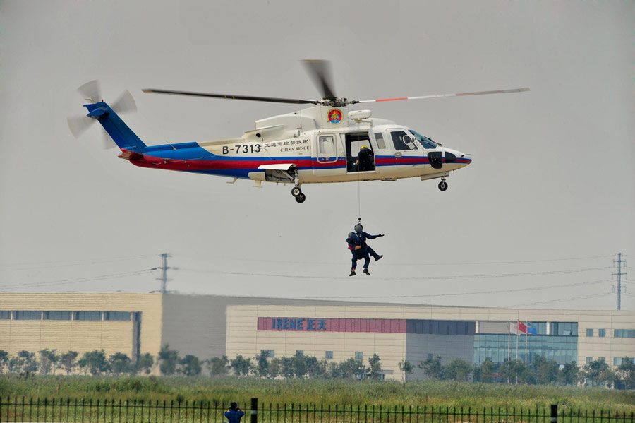 Workers make final preparations for the 2nd China Helicopter Exposition in Tianjin, Sept 3, 2013. More than 200 enterprises from the helicopter industry will attend the expo from Sept 5 to 8. [Photo/Xinhua]