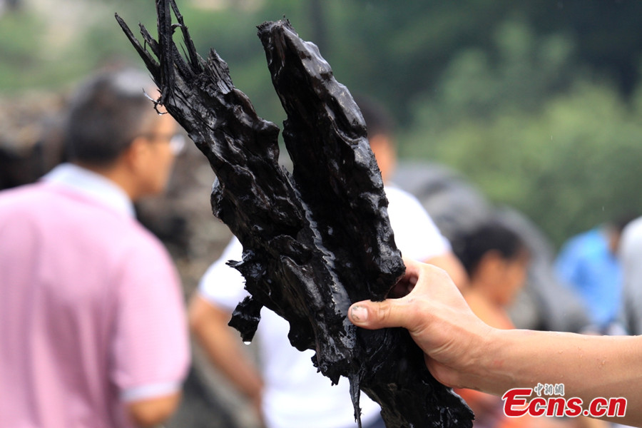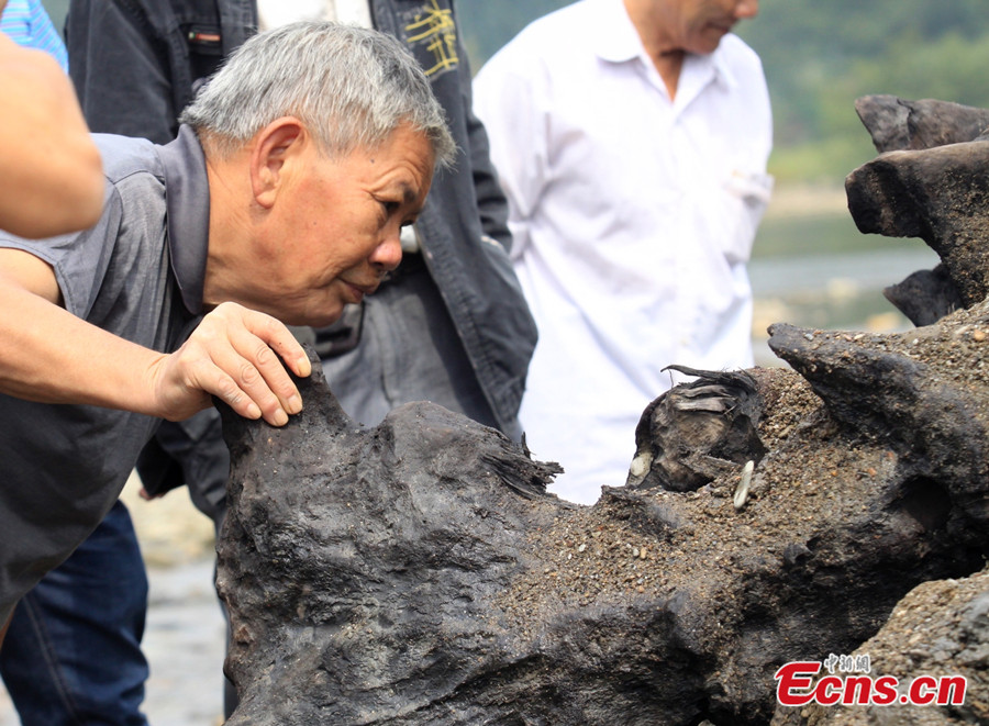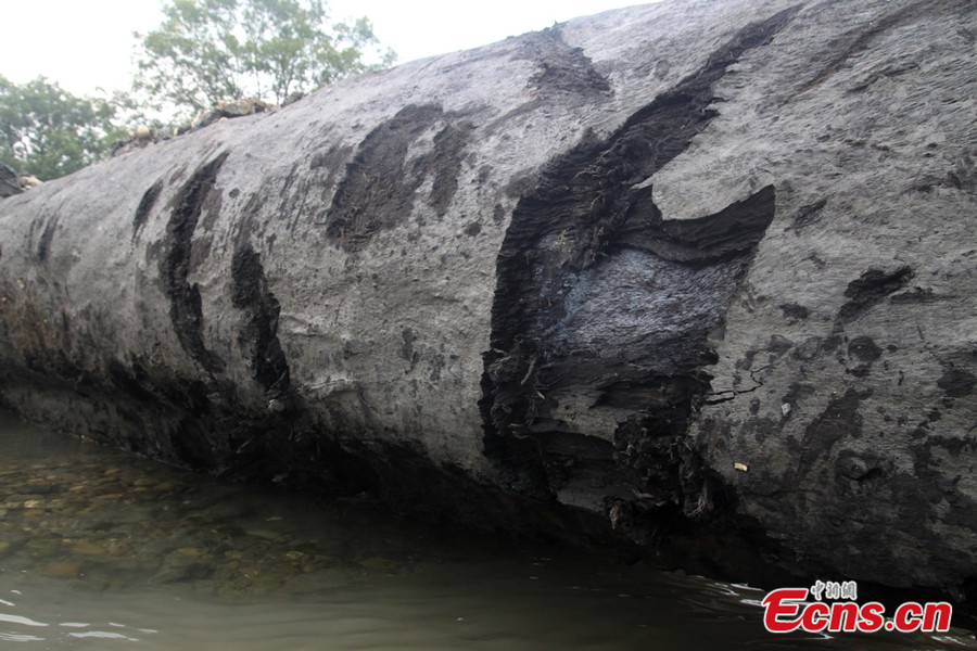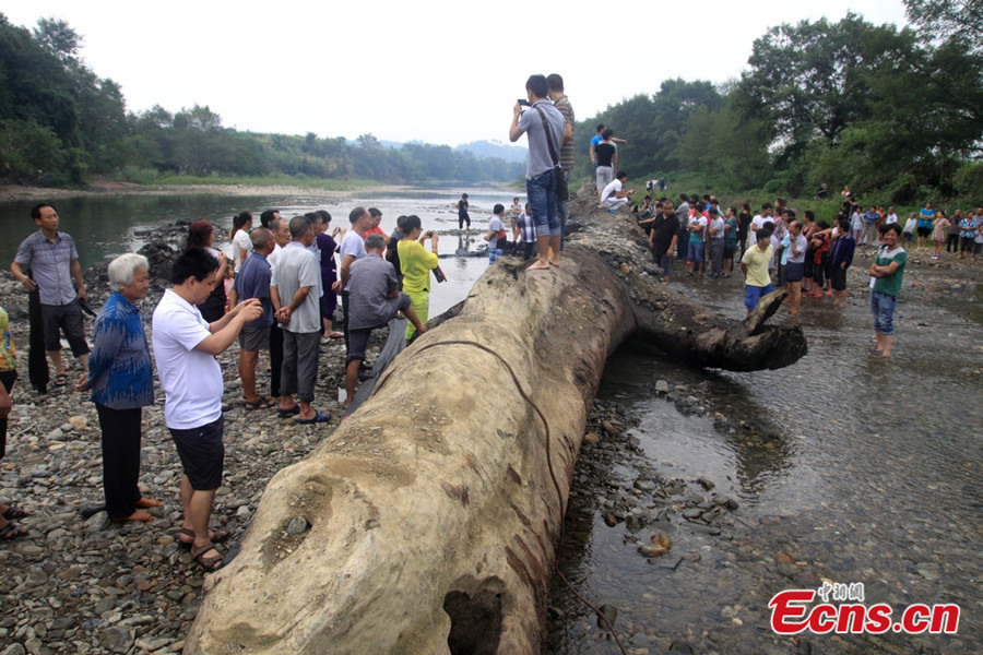 An ancient tree, with a length of 20 meters and an estimated weight of 80 tons, is discovered at Dongshan Village of Xigang Town in Xiushui County of east China’s Jiangxi province on September 3, 2013. According to an expert from the local forestry department, the tree is about 700 to 800 years old and it has been buried in the ground for at least 500 years. [Photo/Huang Yiwei]