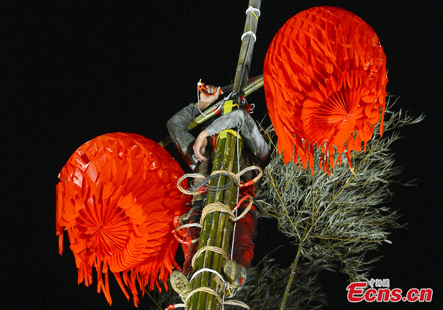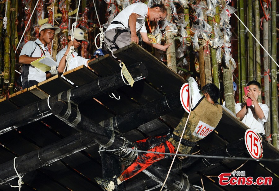 Team members climb the pillars of the "Gu rack" at a Qianggu ceremony in Toucheng of Yilan, Taiwan on September 4, 2013. Each pillar is about 15 storeys high and has a thick layer of oil on it. The traditional ceremony takes place at the end of every ghost month, lunar July. This year a total of 16 teams participate in the competition. [Photo: CNS / Liu Zhen]