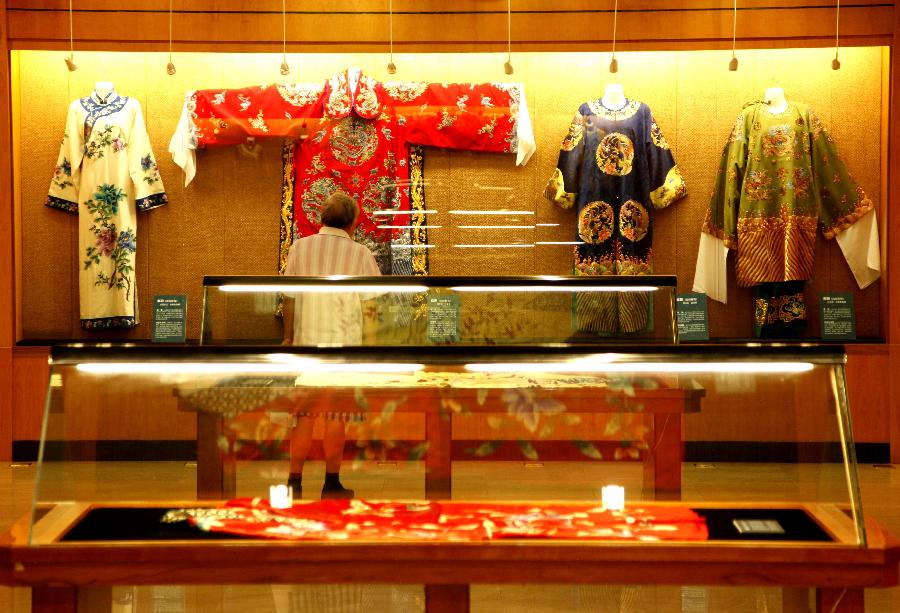 A visitor views Chinese opera costumes during an exhibition in Shanghai, east China, Sept. 4, 2013. (Xinhua/Yuan Jing)