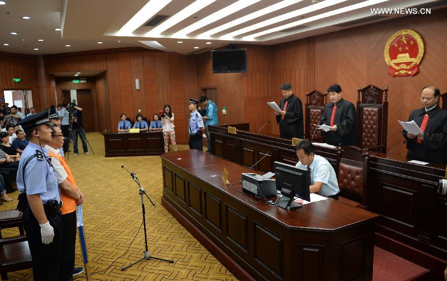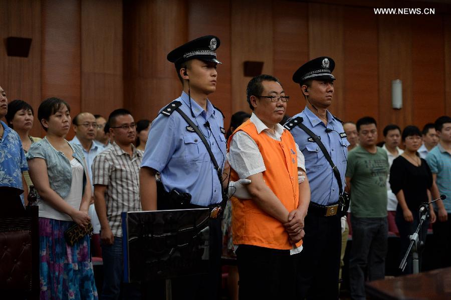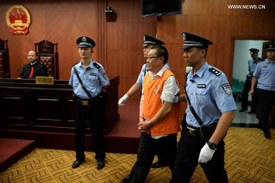 Yang Dacai (C), former head of Shaanxi work safety administration, is on trial at the Xi'an Intermediate People's Court in Xi'an, capital of northwest China's Shaanxi Province, Sept. 5, 2013. Yang, who was found guilty of taking bribes and holding a large amount of property which he cannot account for, was sentenced to 14 years in prison on Thursday.Yang's precipitous plunge from grace began when images of him grinning merrily at the scene of a traffic accident which left 36 people dead appeared online in August of last year. Photographs soon surfaced online of Yang wearing luxury wristwatches, earning him the nickname "Brother Watch." The online anti-graft crusade soon led to an official inquiry. (Xinhua/Li Yibo)