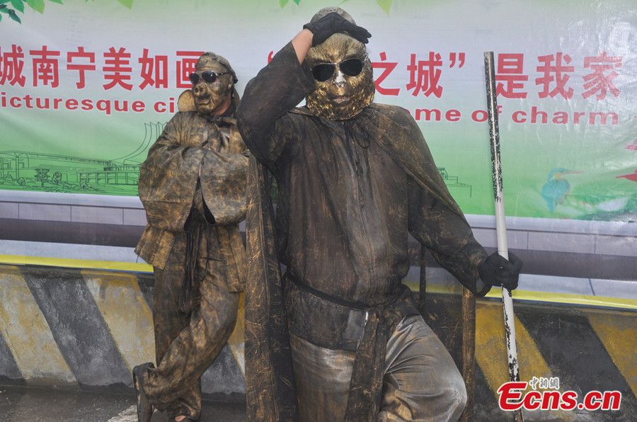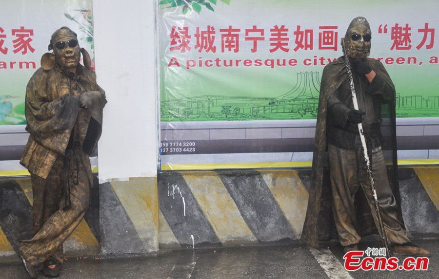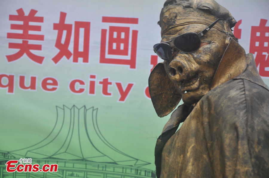 Two performance artists, respectively featuring Monkey King and Evil Pig, are seen at a street of Nanning in Guangxi Zhuang autonomous region on September 5, 2013. Monkey King and Evil Pig are two characters from the classic Chinese novel Journey to the West. [Photo: CNS / Liu Wanqiang]