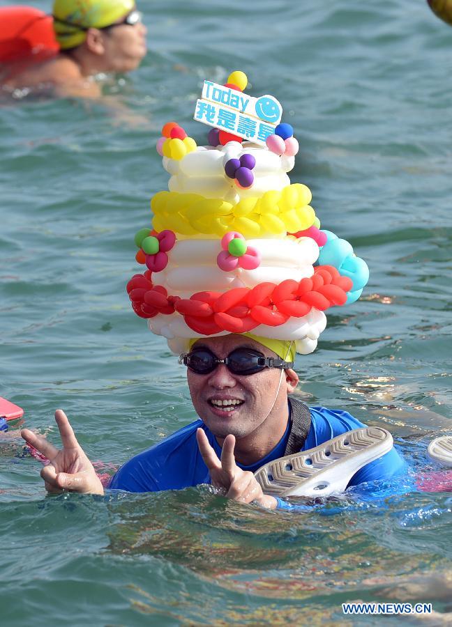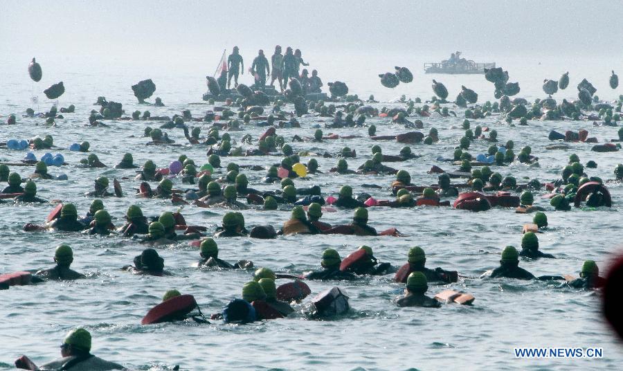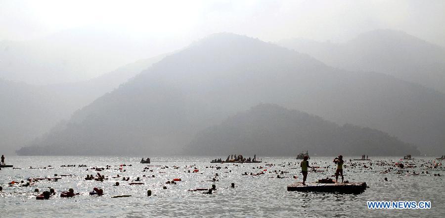 Swimmers participate in the 3,300-meter-long competition of the annual Sun Moon Lake ("Riyue Tan") Swimming Carnival in Nantou County, Taiwan, Sept. 8, 2013. Over 25,000 swimmers from across the world took part in Sunday's event. (Xinhua)