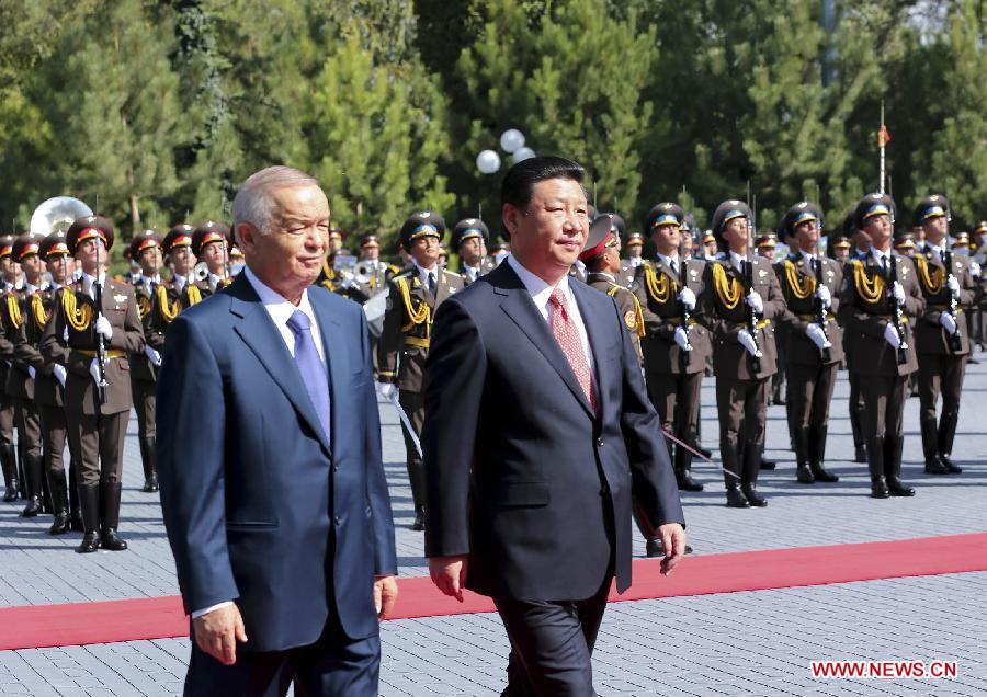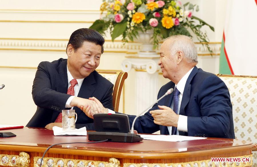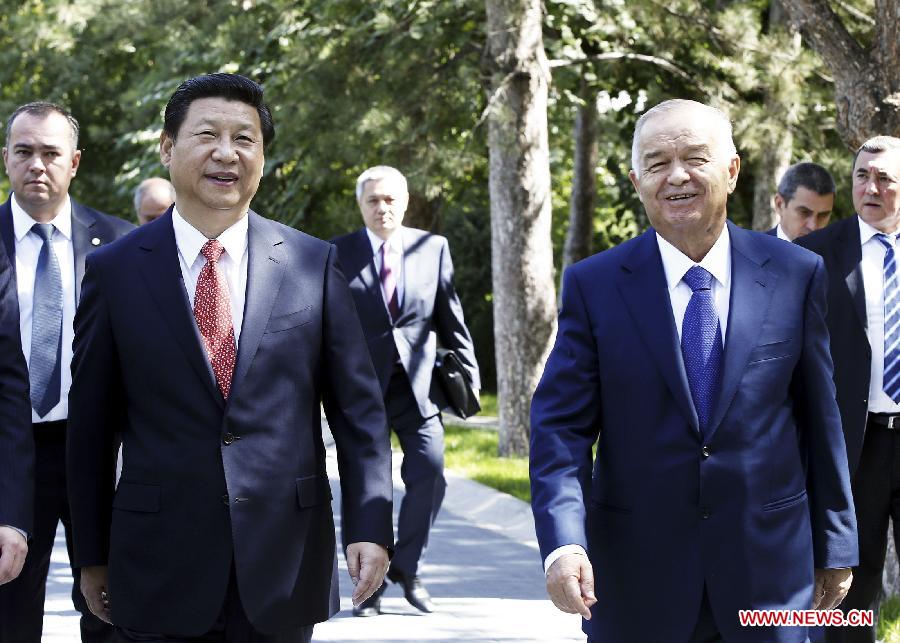 Chinese President Xi Jinping (L) meets with Uzbekistan's President Islam Karimov in Tashkent, Uzbekistan, Sept. 9, 2013. Xi Jinping tabled a five-point proposal on furthering pragmatic cooperation between China and Uzbekistan here on Monday. (Xinhua/Huang Jingwen)