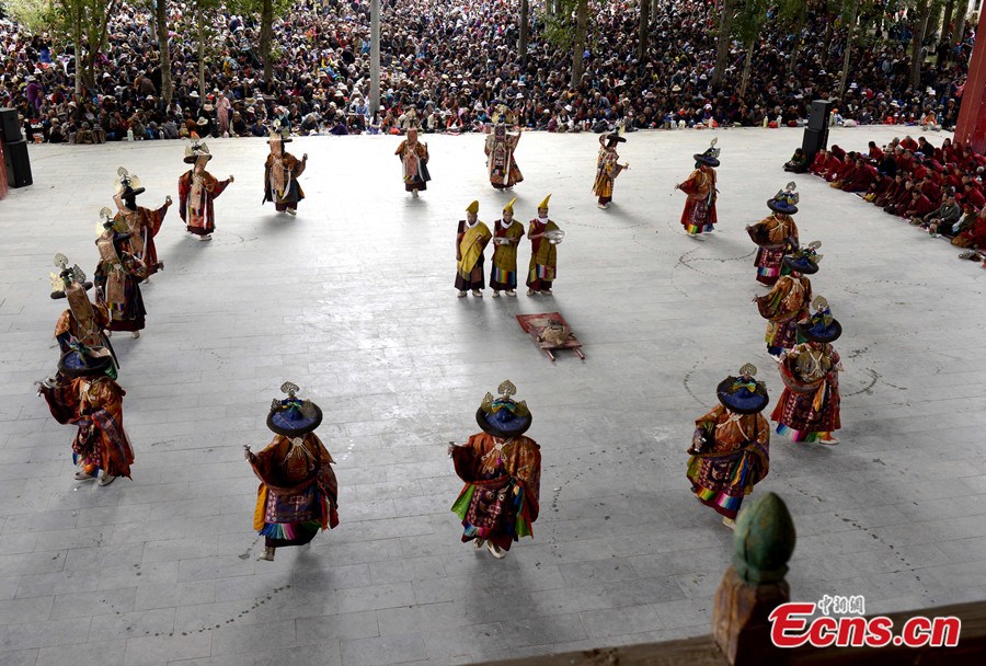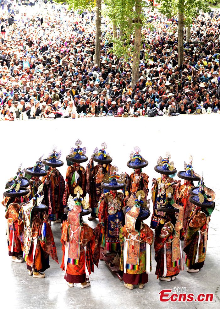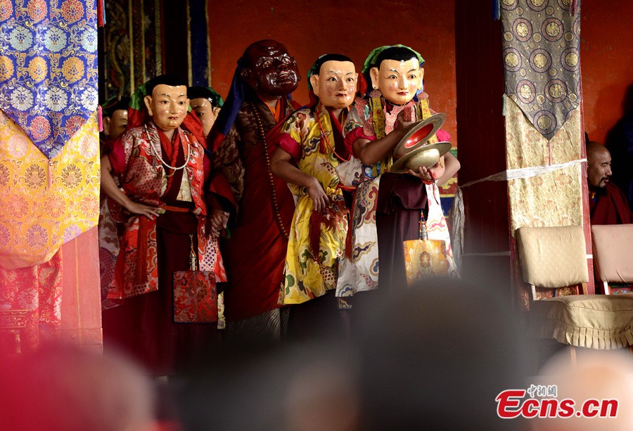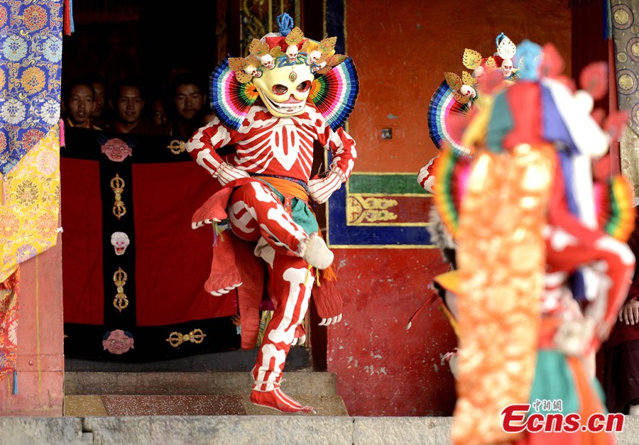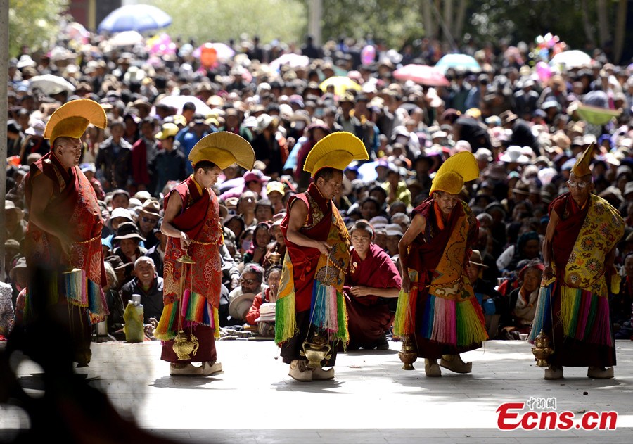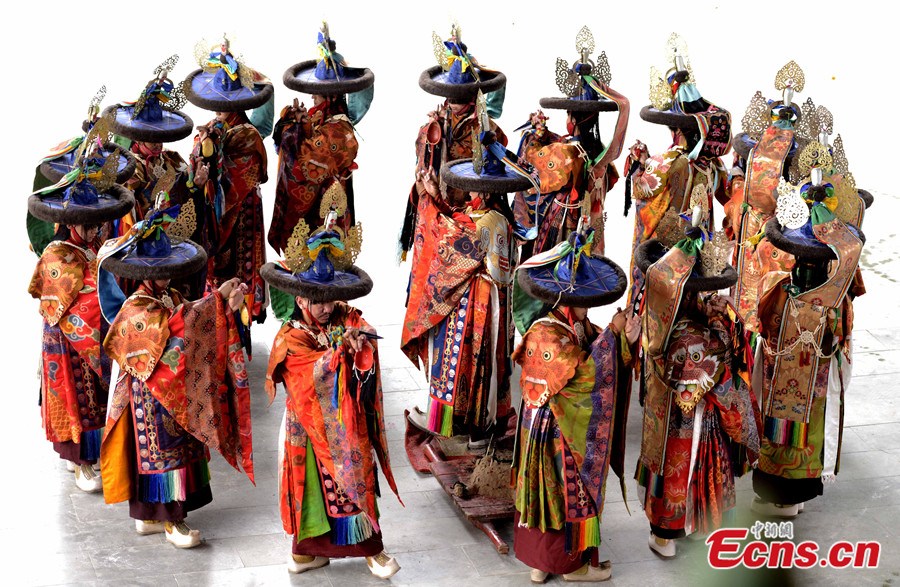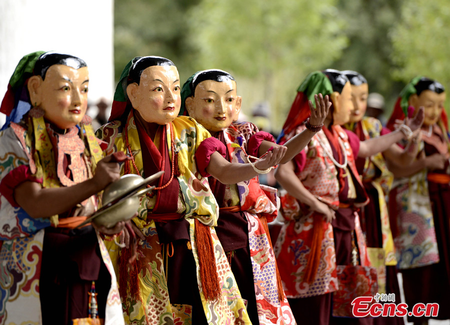 Tibetan monks perform traditional masked dance at the annual religious dance festival of Tashilhunpo Monastery in Shigatse of Tibet Autonomous Region on September 9, 2013. The annual festival falls on August 4 according to the Tibetan calendar. Tashilhunpo Monastery, founded in 1447, is the traditional seat of successive Panchen Lamas and one of the six big monasteries of Gelugpa in Tibet. [Photo: CNS / Li Lin]