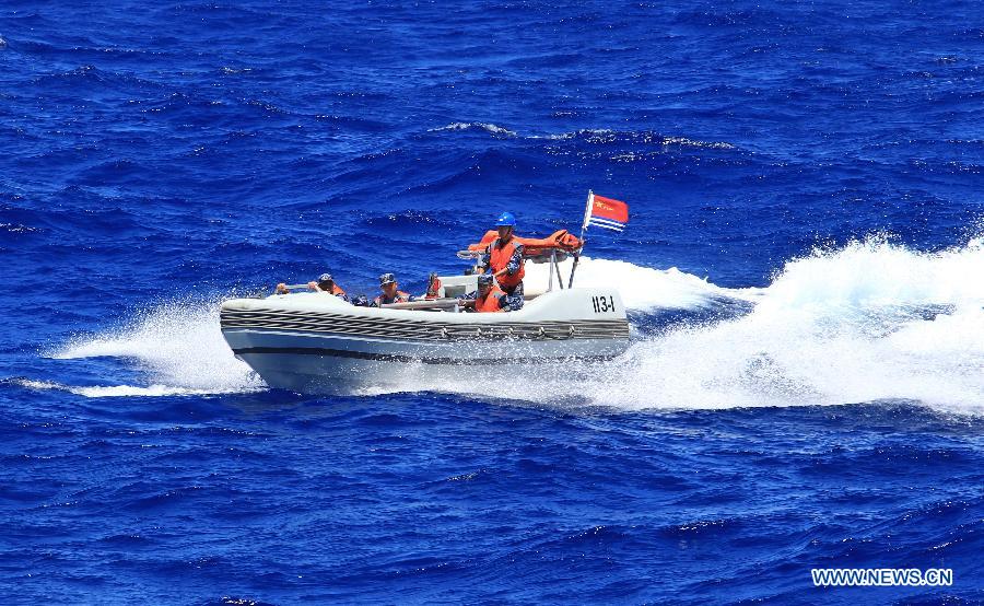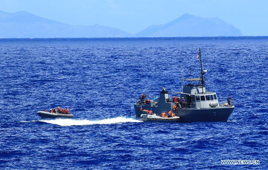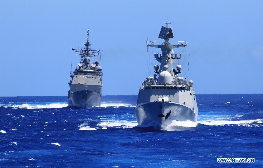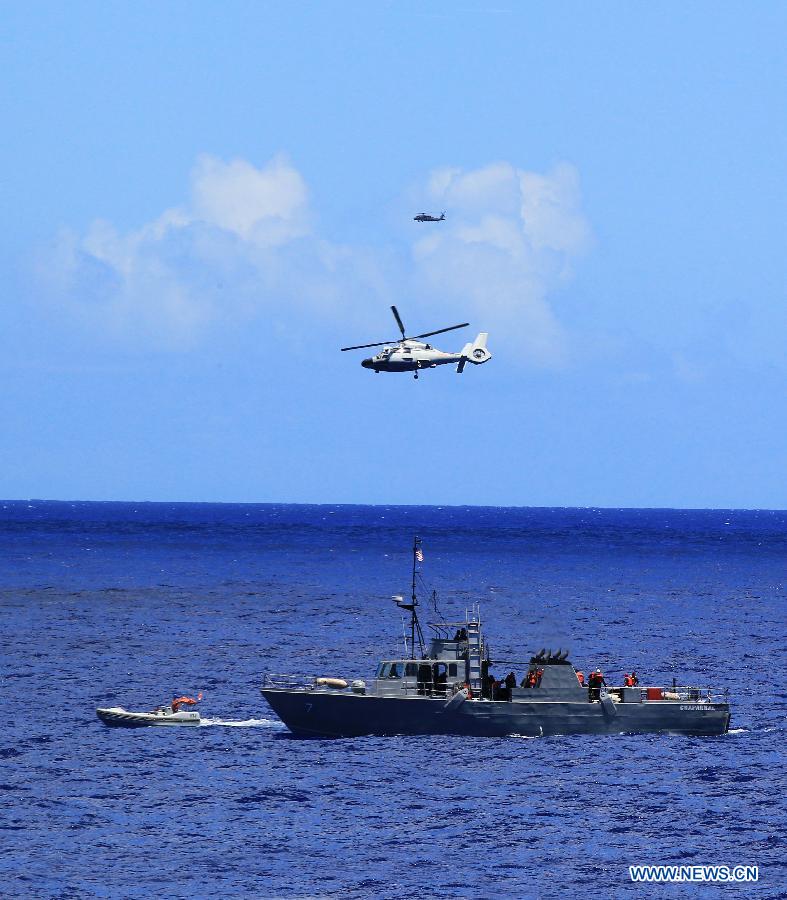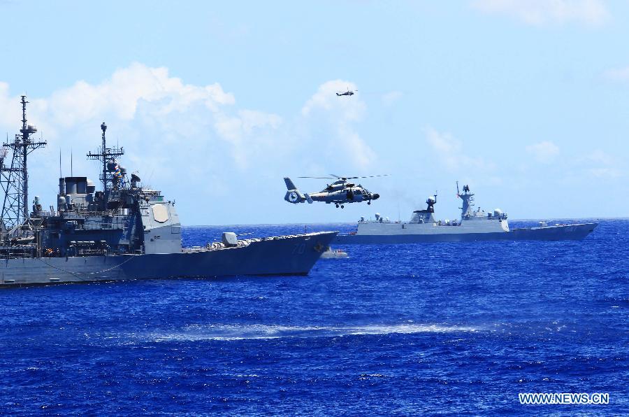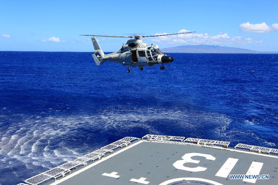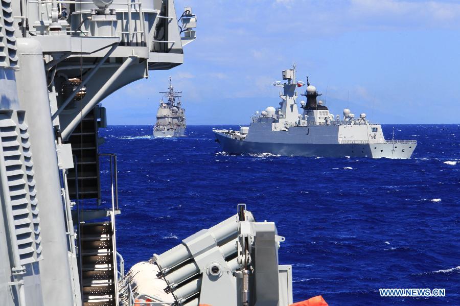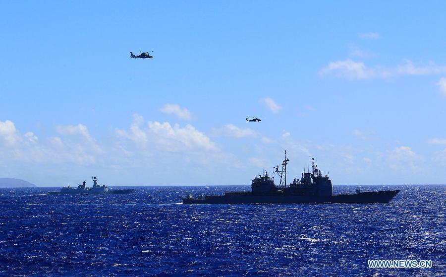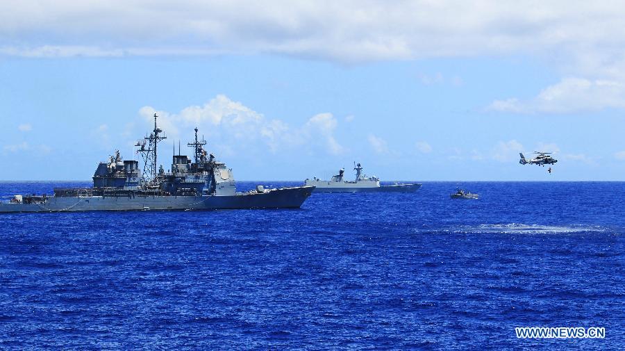 U.S. observers view the search-and-rescue exercise aboard Chinese navy's missile destroyer Qingdao near Hawaii, the United States, Sept. 9, 2013. Four naval ships, including Chinese navy's missile destroyer Qingdao, missile frigate Linyi and USS Lake Erie, and three helicopters, conducted a joint search-and-rescue exercise near Hawaii on Monday. (Xinhua/Zha Chunming)