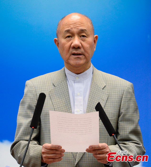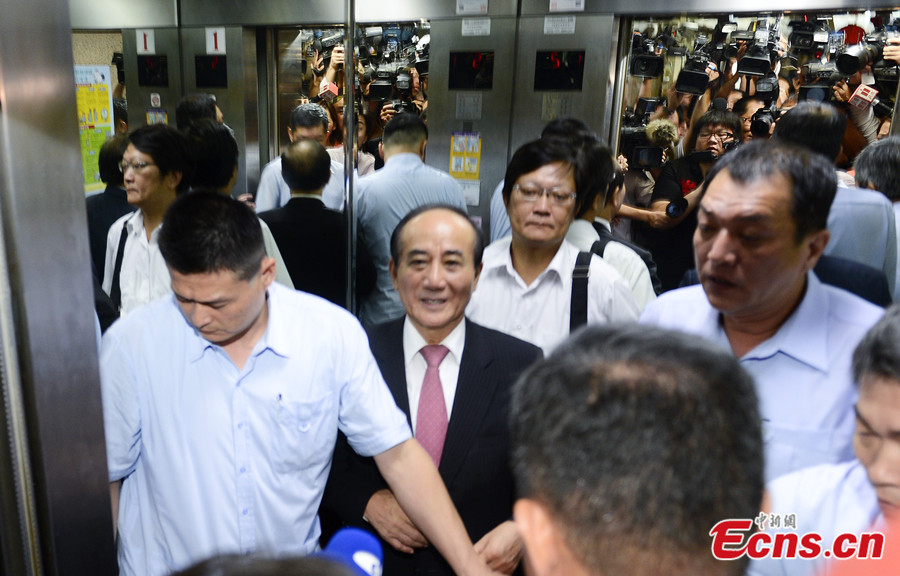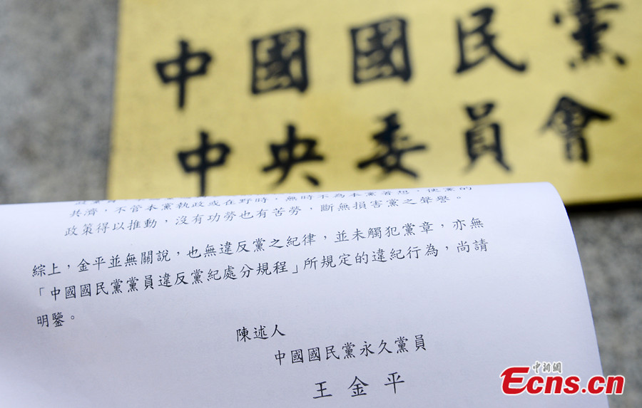Wang Jin-pyng (C), head of Taiwan's legislative body, delivers a letter of statement in person to the Kuomintang (KMT) disciplinary committee in the morning on Sep. 11, 2013. In the statement, Wang identified himself as a permanent member of the KMT and reiterated that he had done nothing wrong. He left the party headquarters immediately after. Then the committee declared that Wang was stripped of KMT membership. [Photo: CNS/ Liu Zhen]