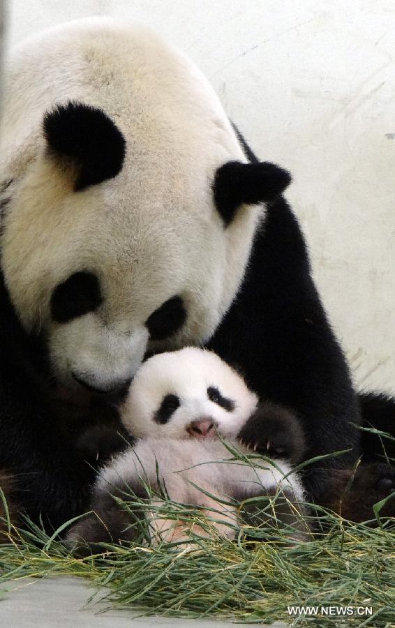 Giant panda cub nicknamed "Yuan Zai" stays with its mother "Yuan Yuan" at the Taipei Zoo in Taipei, southeast China's Taiwan, Sept. 11, 2013. The female cub, born on July 6, weighs about 4.2 kilograms. It is the first baby of giant pandas "Tuan Tuan" and "Yuan Yuan", which were presented as goodwill gifts to Taiwan by the Chinese mainland. (Xinhua/Taipei Zoo)