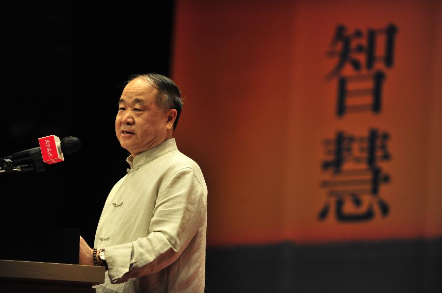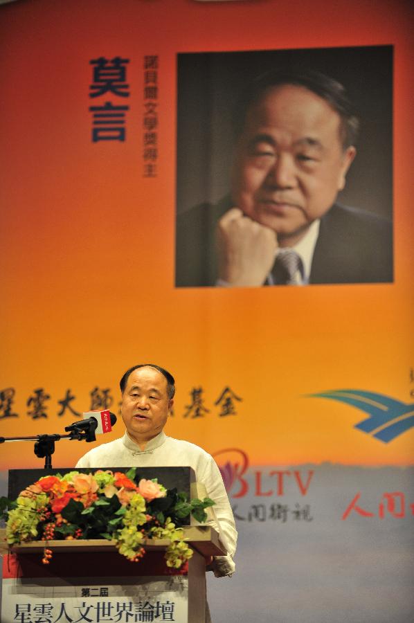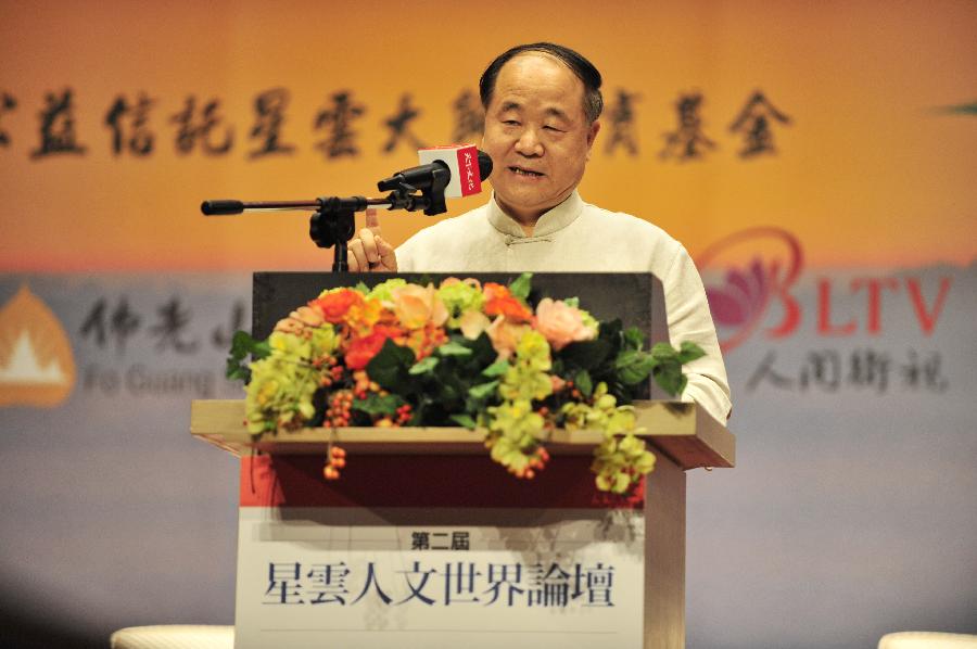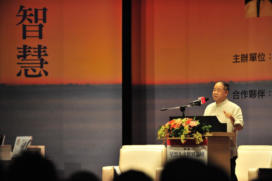 Chinese writer Mo Yan, who is the 2012 Nobel Prize winner for literature, addresses a forum in Kaohsiung, southeast China's Taiwan, Sept. 15, 2013. (Xinhua/Lu Peng)