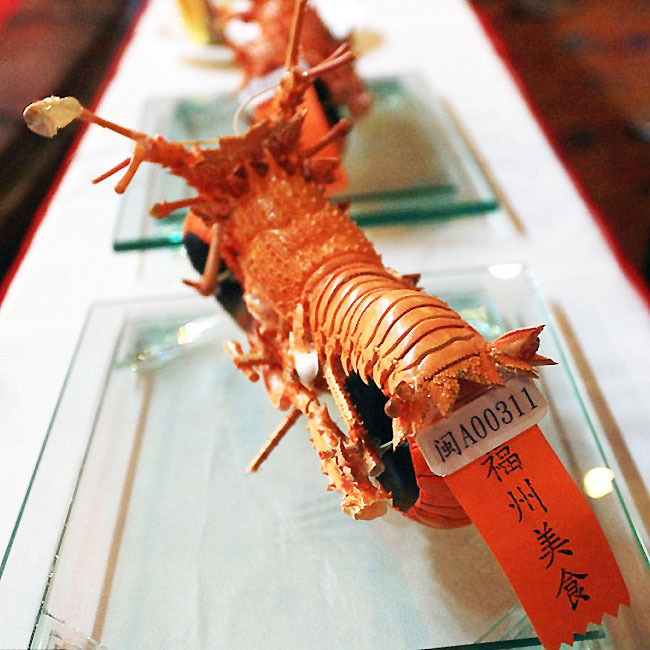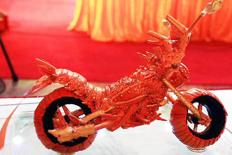 Photo shows a miniature motorcycle made by a Taiwanese chef from lobster shells. The chef presented his collection at a food art seminar in Fujian province to the amazement of those in attendance. [Photo/Huanqiu]