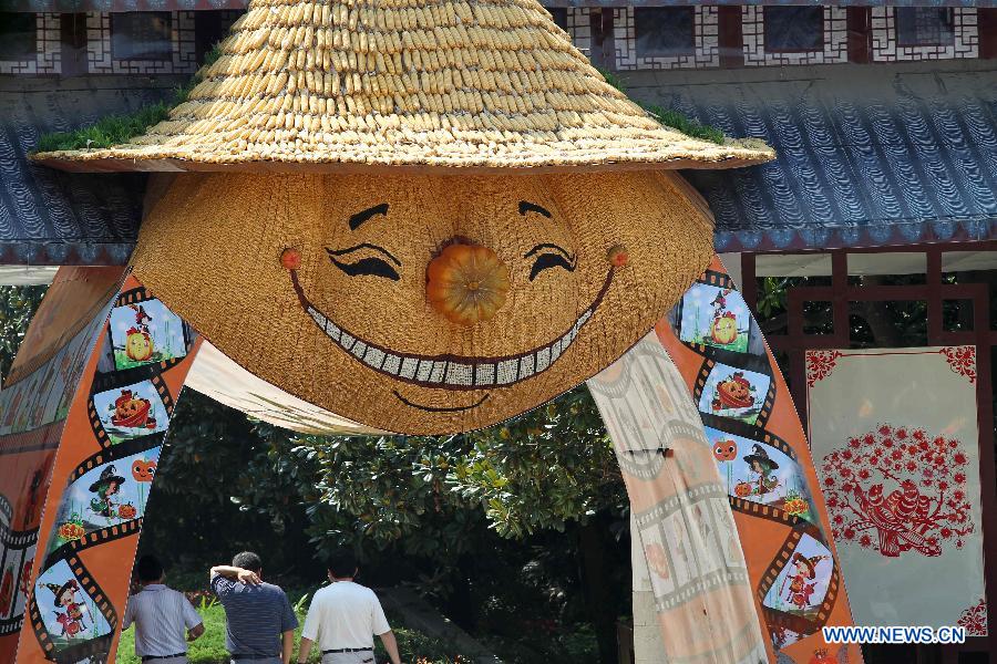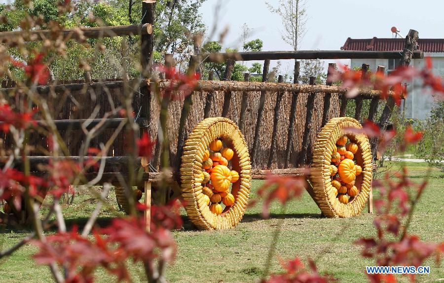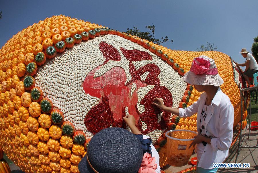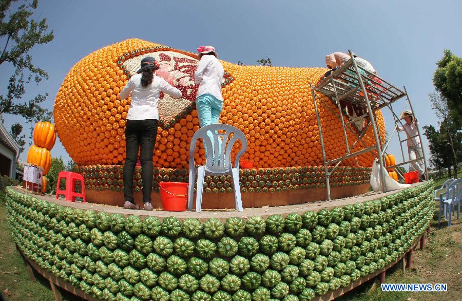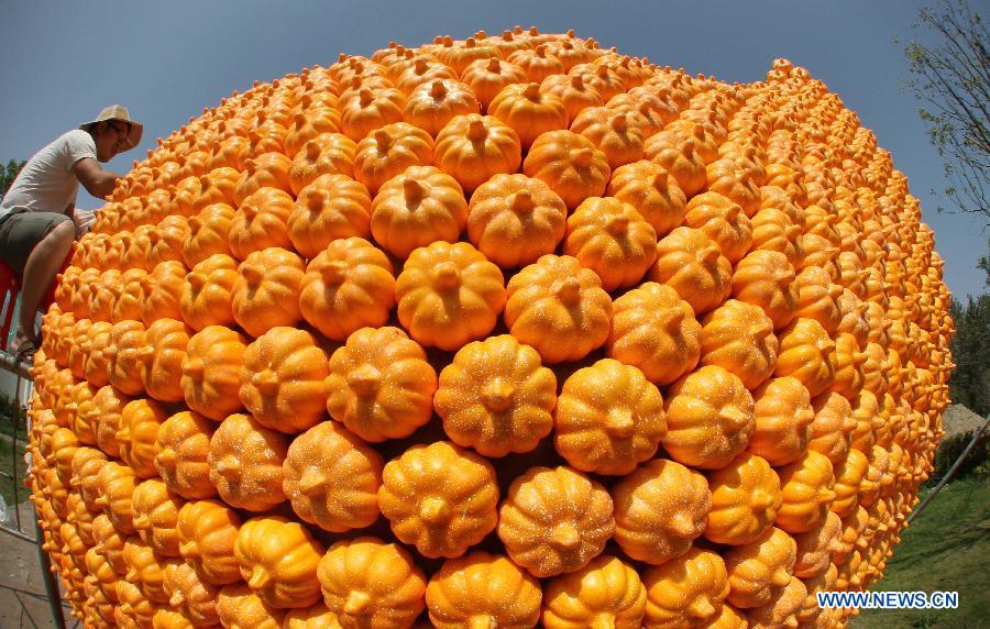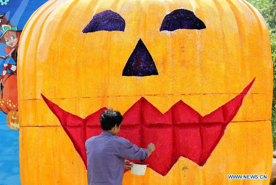 A man works on a huge artificial pumpkin in Seyuan of Nantong, east China's Jiangsu Province, Sept. 16, 2013. Seyuan will hold its first All-Saint's Day Pumpkin Festival from Sept. 25 to Nov. 25, in which more than 30,000 artificial pumpkins will form a pumpkin kingdom.(Xinhua/Xu Congjun)