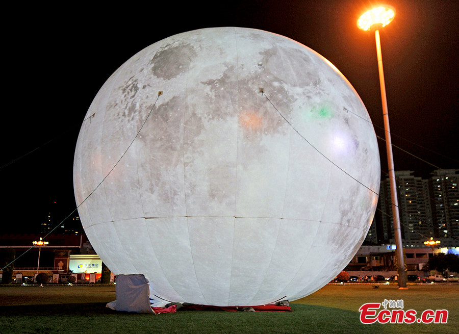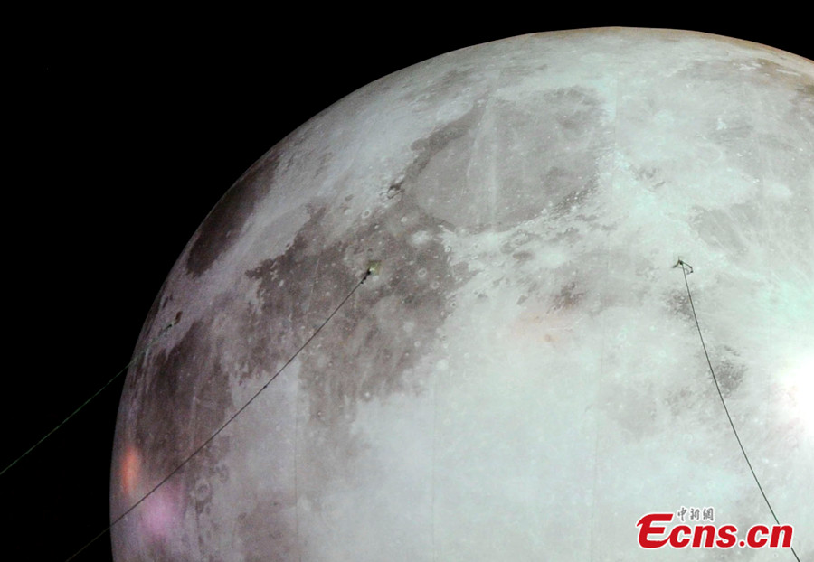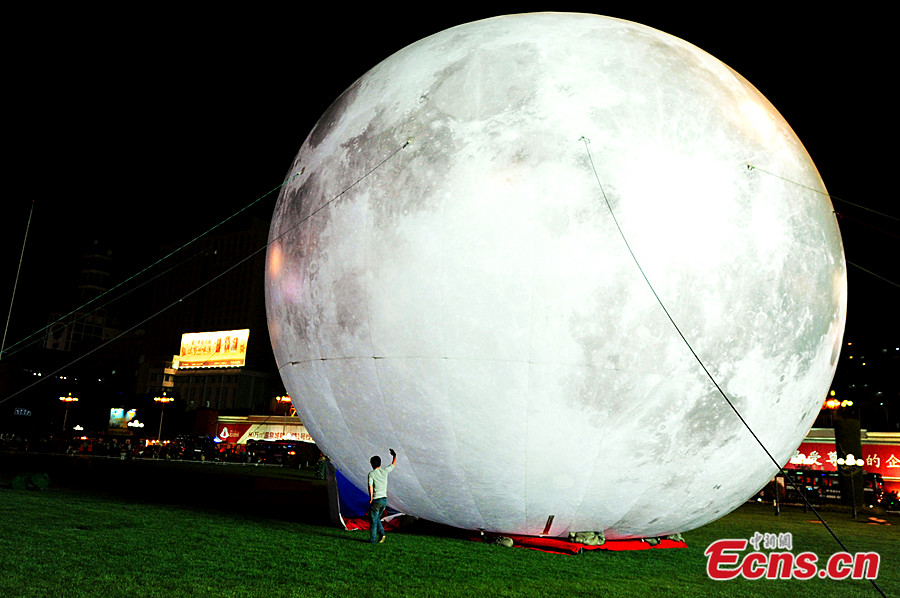 An artificial moon, with a diameter of 15 meters, is seen at a square in Lanzhou of northwest China's Gansu province on September 16, 2013. [Photo: China News Service/Yang Yanmin]