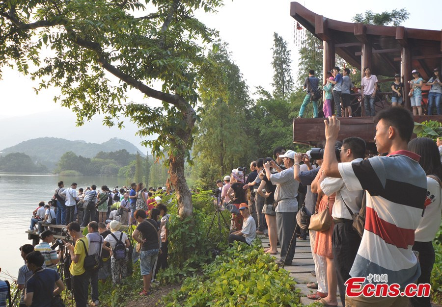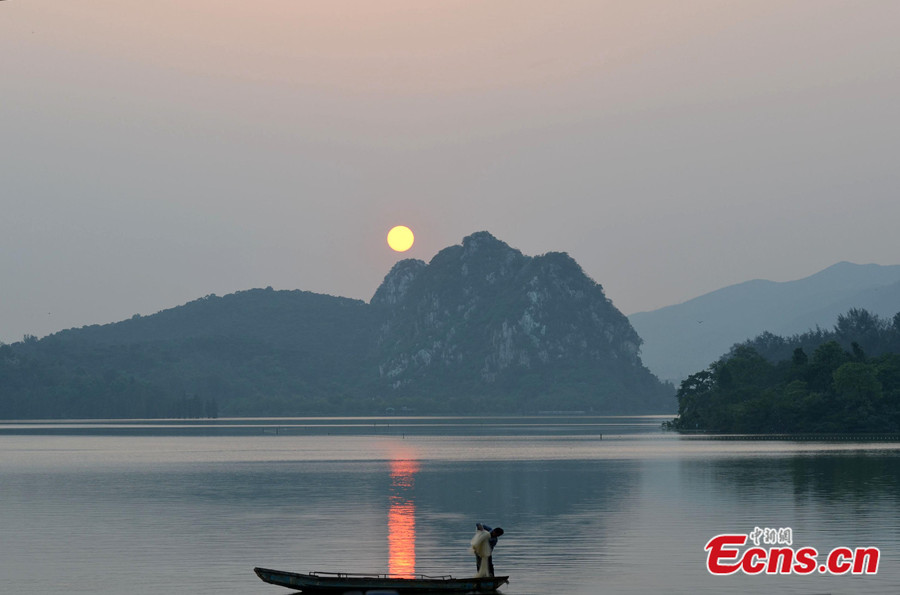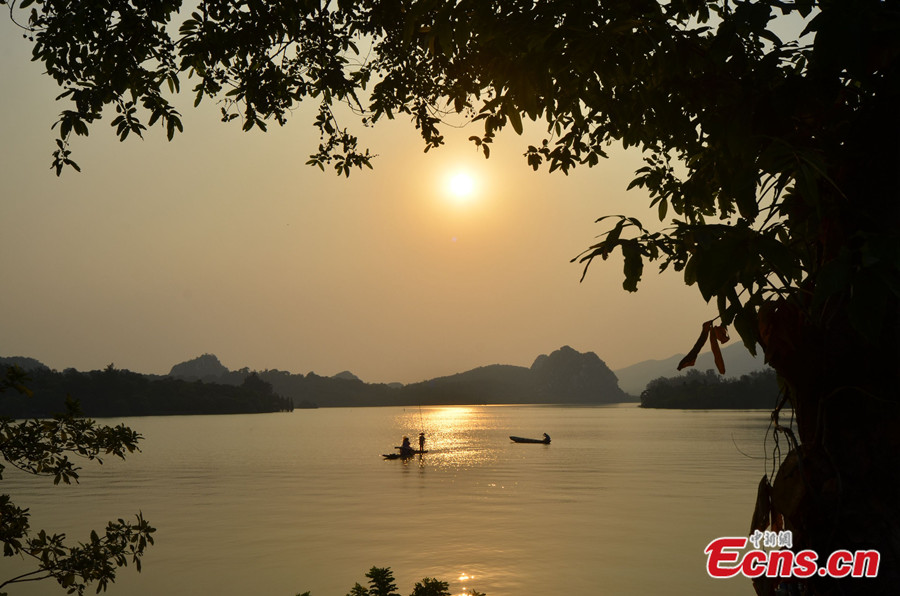 Visitors take photos of sunset scenery at Xinghu Lake Wetland Park of Seven Star Crag Scenic Area in Zhaoqing city of Guangdong province on September 17, 2013. [Photo: China News Service / Huang Yaohui]