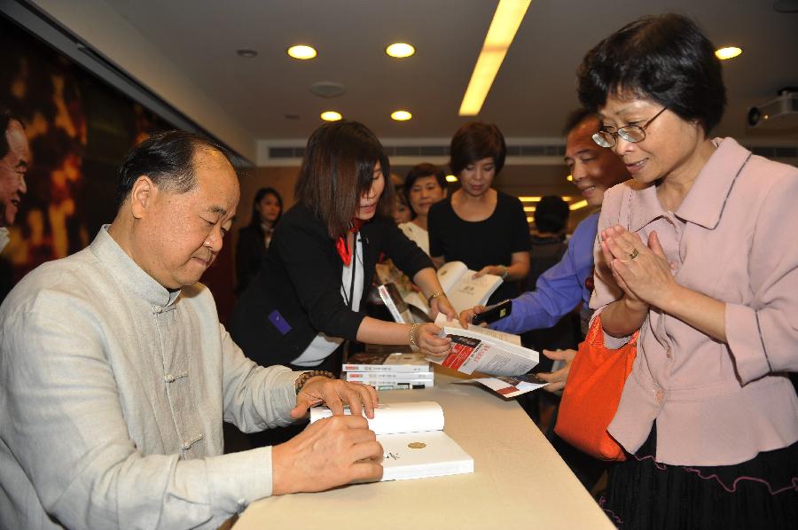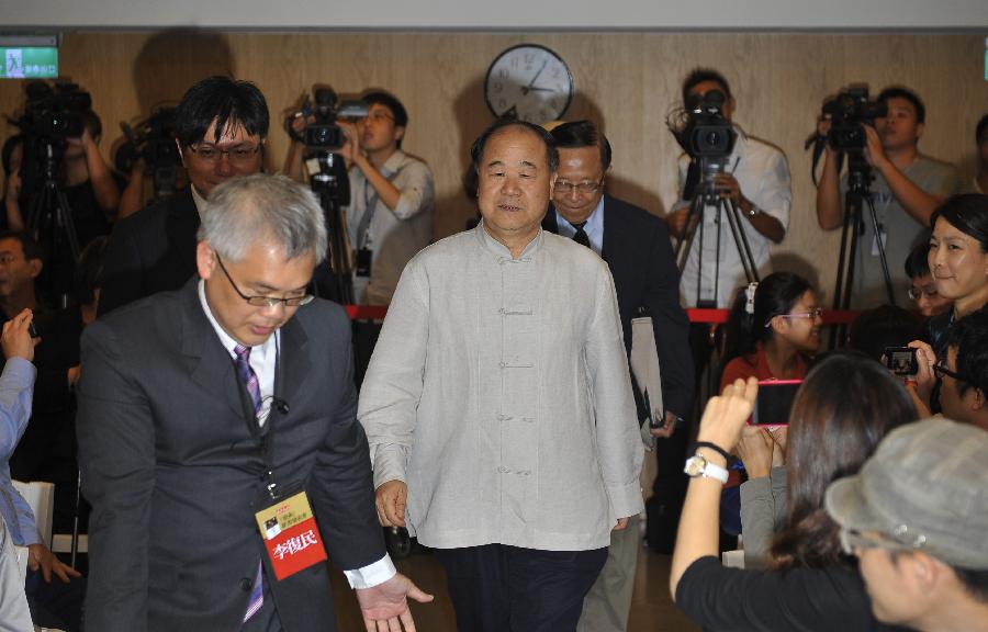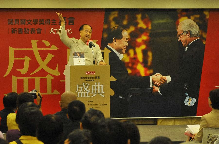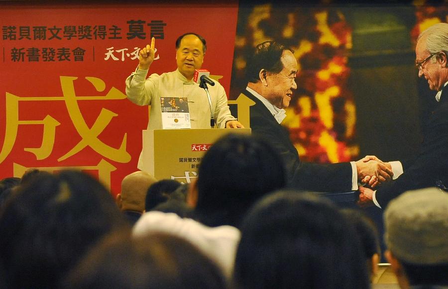 Chinese author and Nobel prize winner Mo Yan gives a speech at an event to promote his new book Grand Ceremony, which documents his trip to Sweden to receive the Nobel Prize in Literature and includes his speeches, interviews and diary entries, in Taipei, southeast China's Taiwan, Sept. 21, 2013. (Xinhua/Lu Peng)