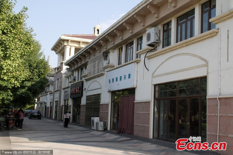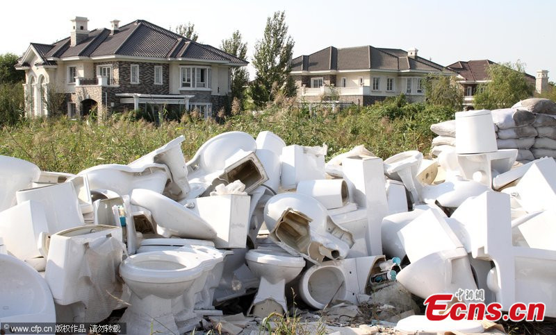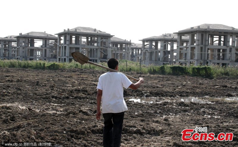 Photo taken on September 21, 2013 shows a worker standing before unfinished villas of Jingjin New City in Tianjin's Baodi District. The town, planned to be the largest building complex of villas in Asia, has become another one of China's empty cities, as its occupancy rate has descended and hundreds of villas are in a suspended state. Most of the restaurants, hotels and supermarkets have been closed, with only some eye-catching billboards left on the city's quiet, deserted streets. [Photo: CFP]
