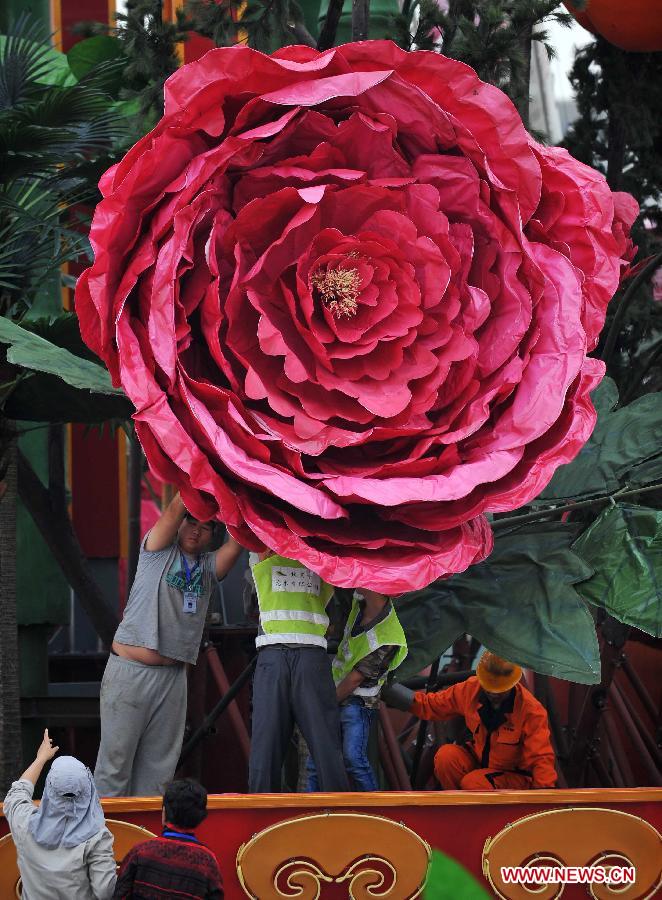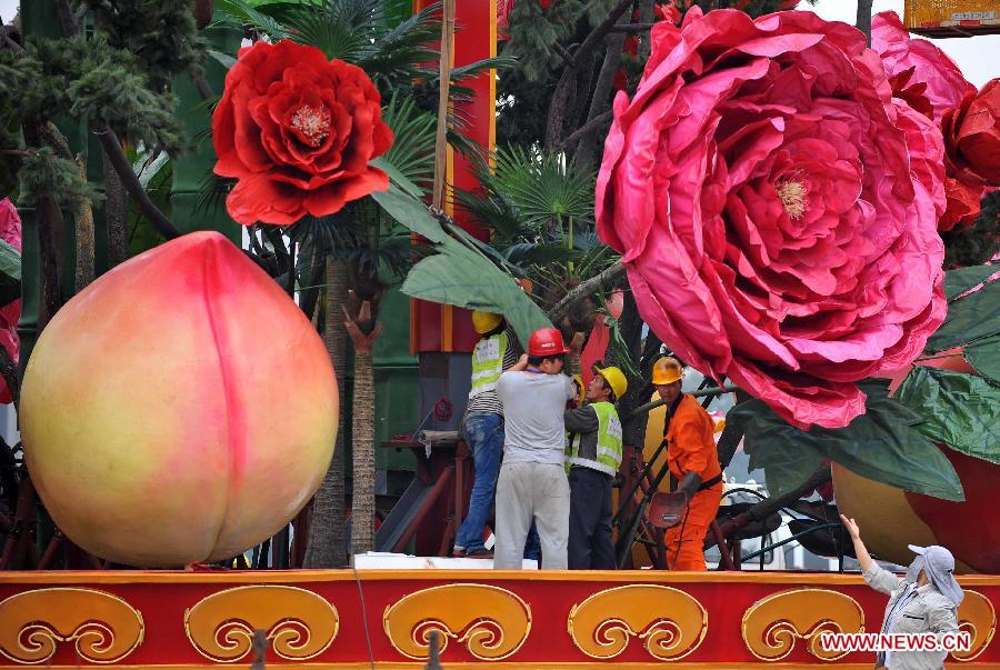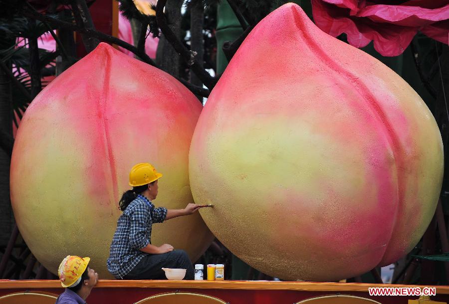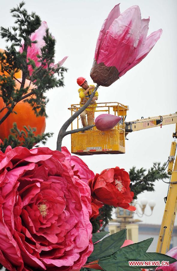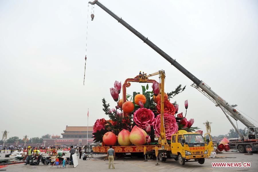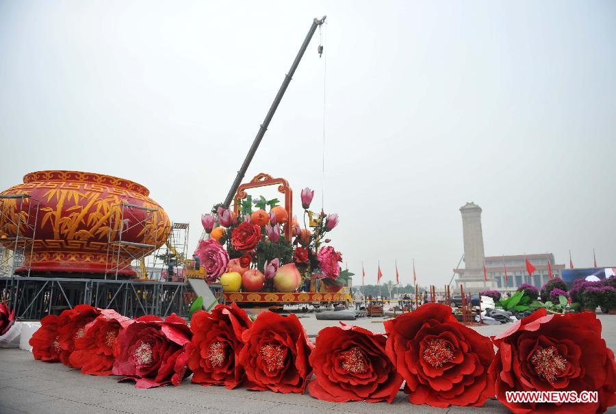 Workers install decorations at the Tian'anmen Square for the coming National Day, which falls on Oct. 1, in Beijing, capital of China, Sept. 22, 2013. (Xinhua/Chen Yehua)