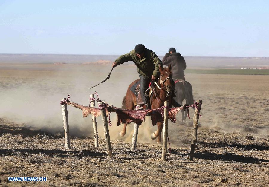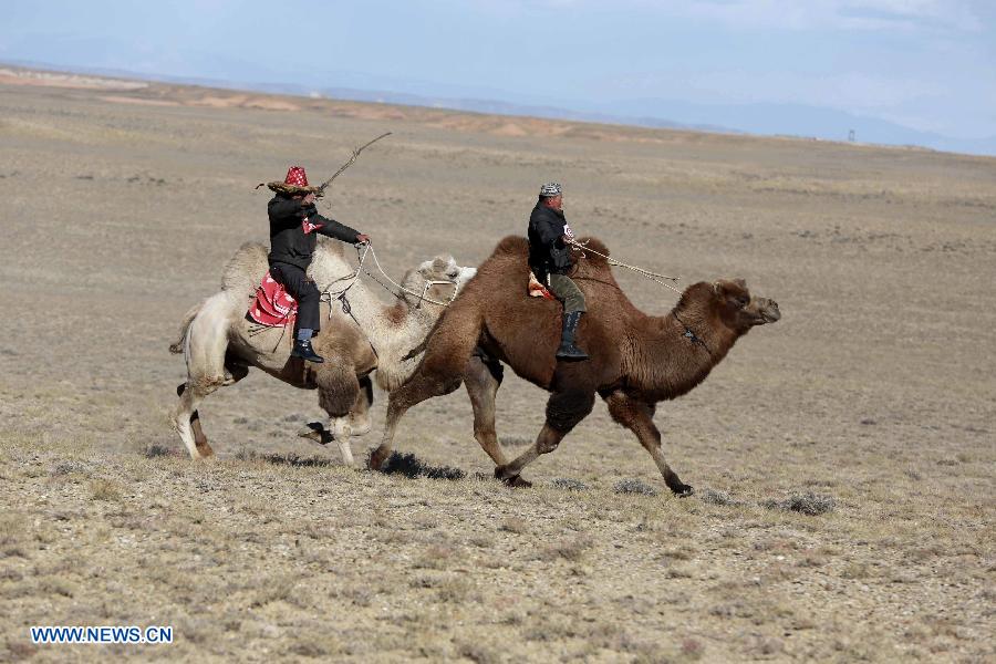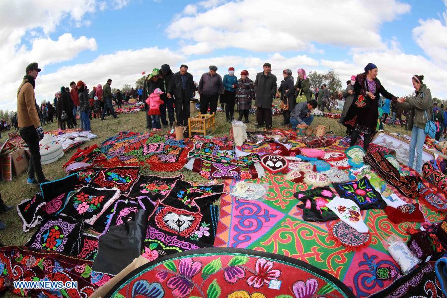 People view the embroideries displayed at the 18th Aqin Aytis festival in Fuyun County, northwest China's Xinjiang Uygur Autonomous Region, Sept. 21, 2013. Besides the Aqin Aytis, a kind of traditional oral art among the people of the Kazakh ethnic group, various traditional folk sports were also staged at the festival. (Xinhua/Ding Ning)