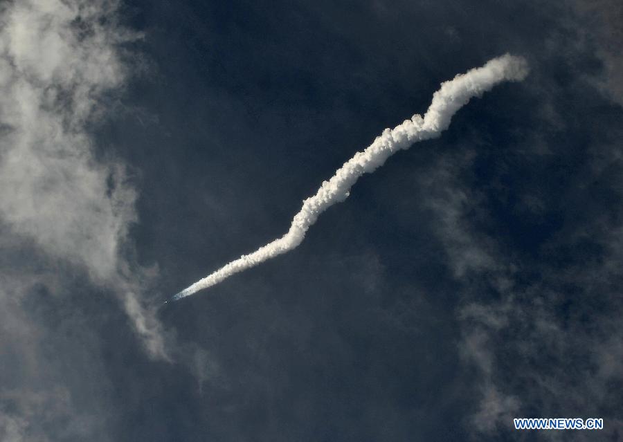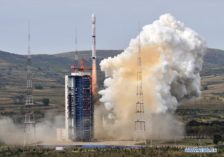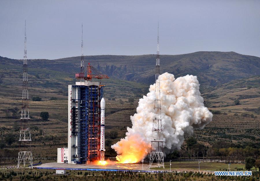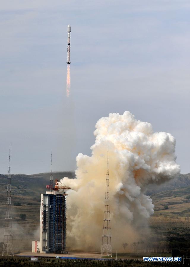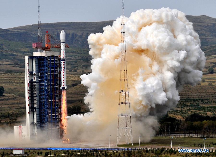 Photo taken on Sept. 23, 2013 shows a Long March-4C carrier rocket carrying a China's Fengyun-3 satellite taking off from the Taiyuan Satellite Launch Center, north China's Shanxi Province. The new satellite, the third of China's Fengyun-3 (FY-3) series, will form a network with the first two FY-3 satellites to improve China's meteorological observation and medium-range weather forecast capabilities. (Xinhua/Yan Yan)