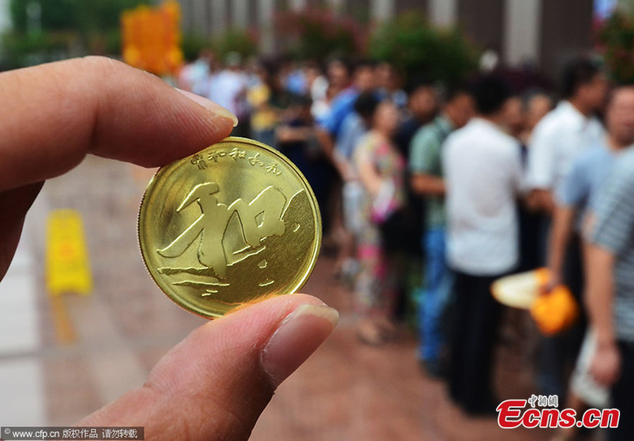 Photo taken on September 23, 2013 shows a 5-yuan commemorative coin, issued by the People's Bank of China (PBOC). The PBOC issued 50 million 5-yuan brass coins nationwide Monday that has the Chinese character "Harmony" on the back. The coin costs 5 yuan and can be used as currency. [Photo/CFP]