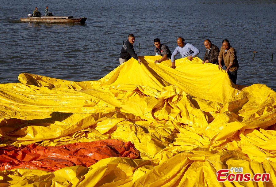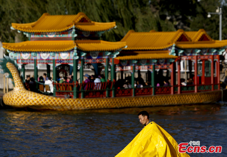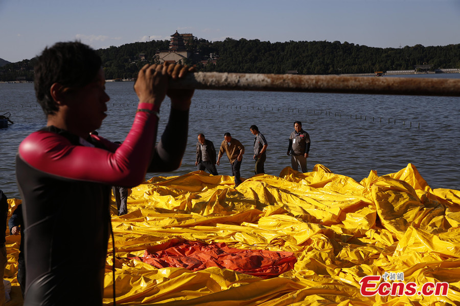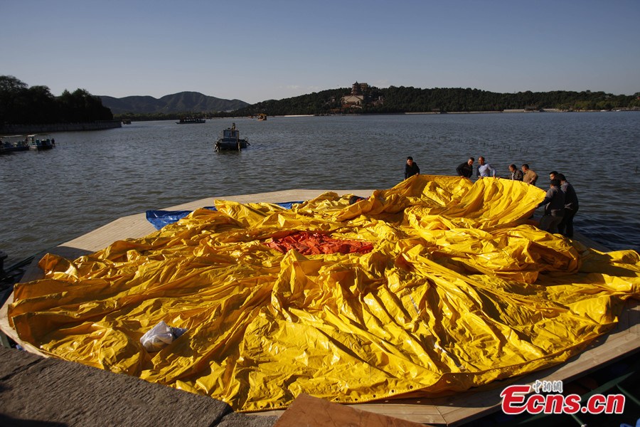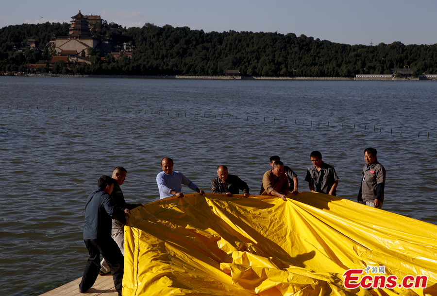 Workers prepare the rubber duck at the Summer Palace in Beijing on September 24, 2013. Dutch artist Florentijn Hofman's giant rubber duck will be on display in the park from September 26. [Photo: China News Service / Liu Guanguan]
