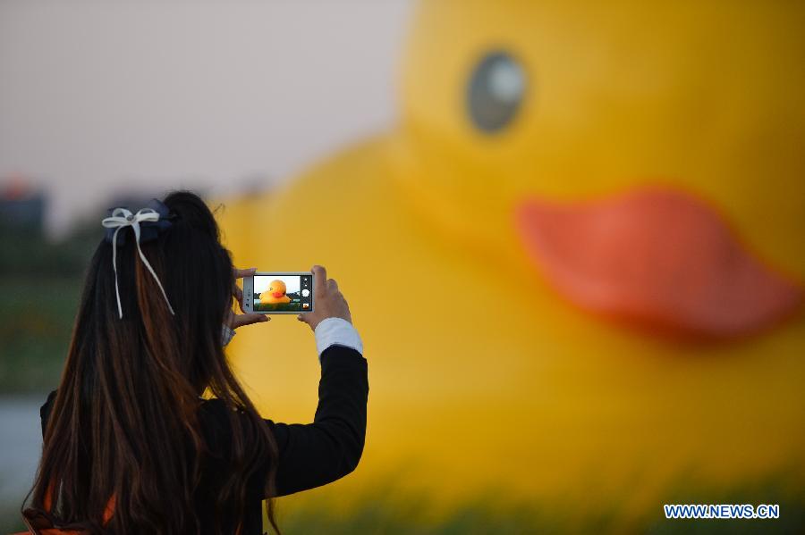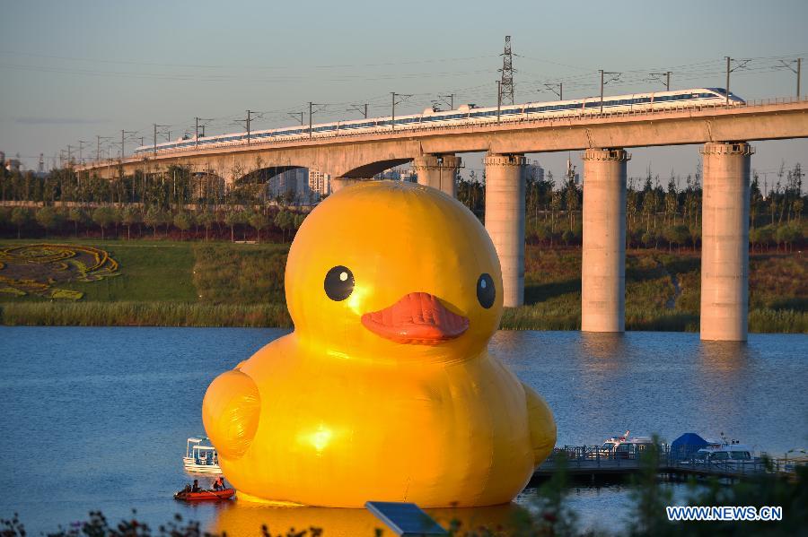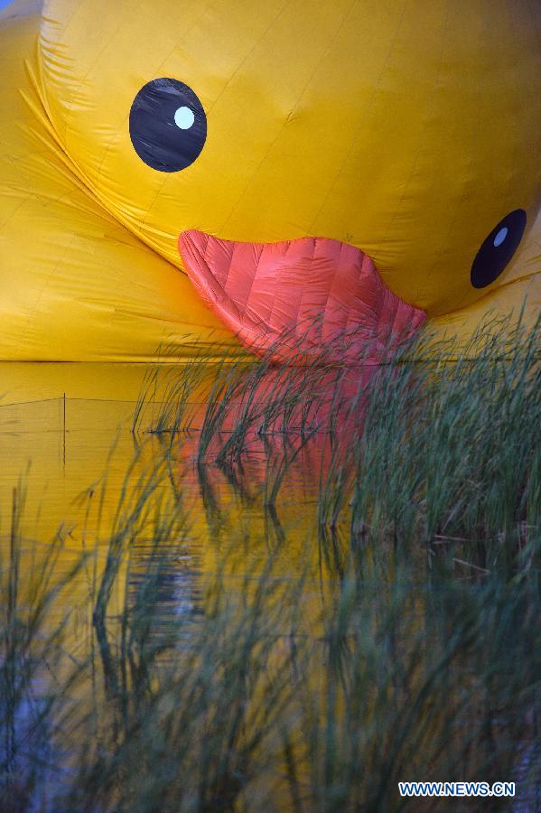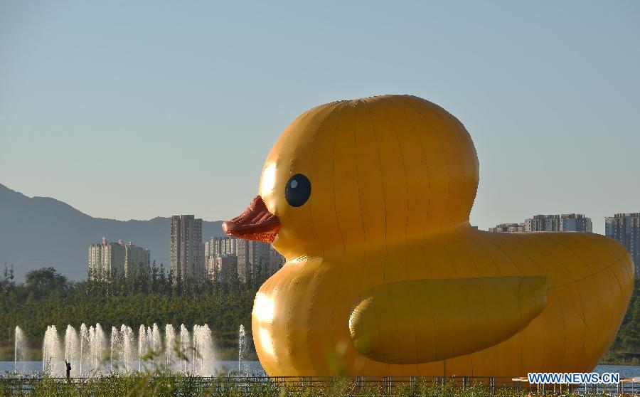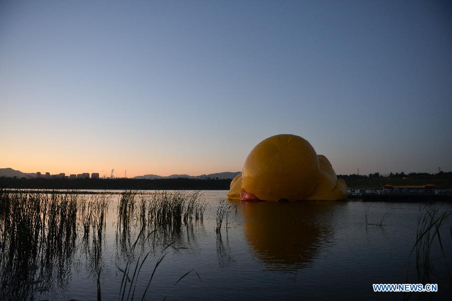 The giant yellow rubber duck "kisses" the lake water as if to say goodbye at the Garden Expo Park in Beijing, capital of China, Sept. 24, 2013. The giant yellow rubber duck, created by Dutch artist Florentijn Hofman, will be moved to the Summer Palace and meet with visitors on Thursday. (Xinhua/Li Xin)