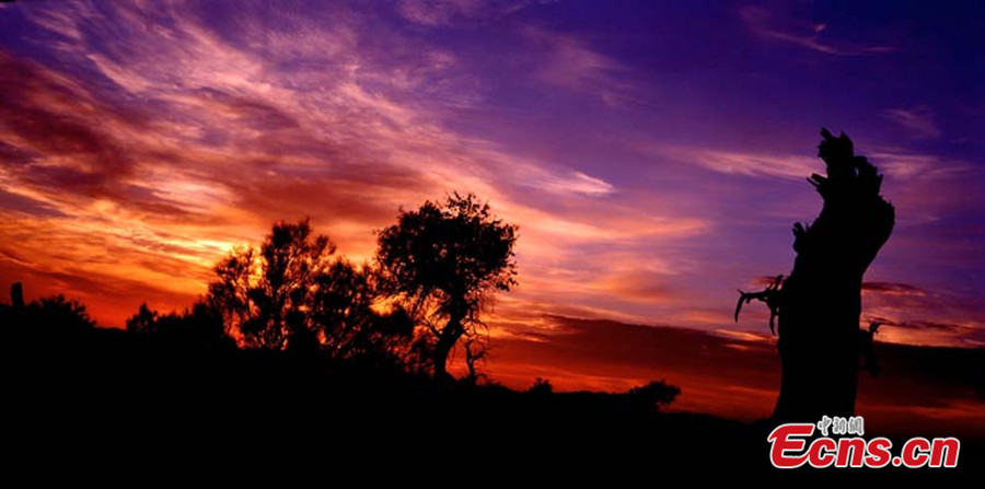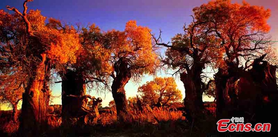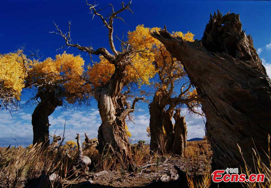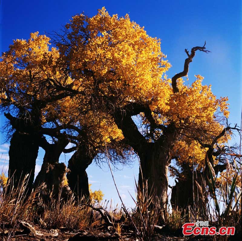 Photo shows diversiform-leaved poplars at Mori Kazak Autonomous County in China's Xinjiang Uygur Autonomous Region. [Photo/Yang Tao]