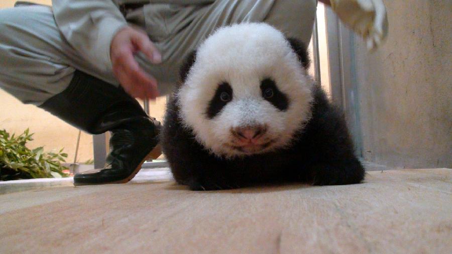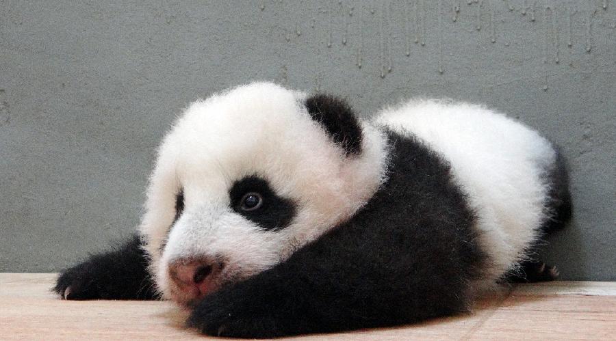 Giant panda cub nicknamed "Yuan Zai" practises crawling at the Taipei Zoo in Taipei, southeast China's Taiwan, Sept. 24, 2013. The female cub, born on July 6, is the first baby of giant pandas "Tuan Tuan" and "Yuan Yuan", which were presented as goodwill gifts to Taiwan by the Chinese mainland. (Xinhua/Taipei Zoo)