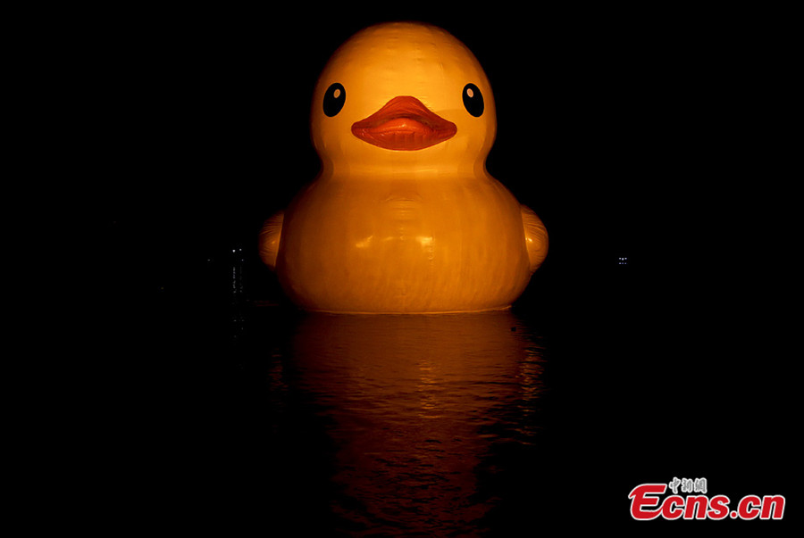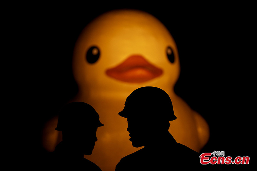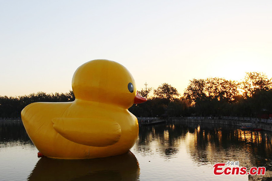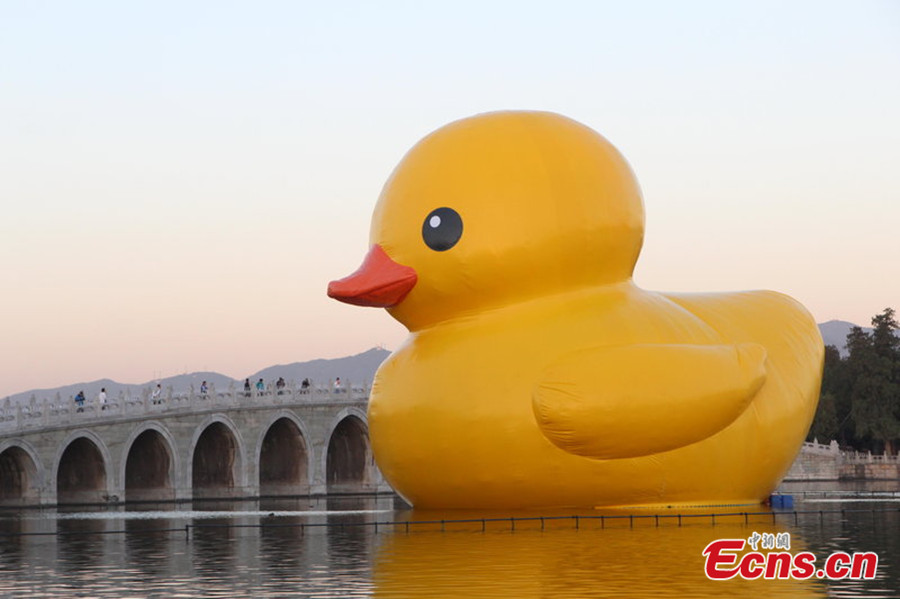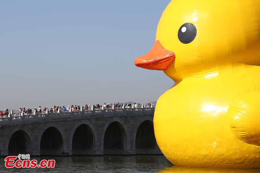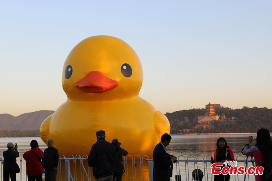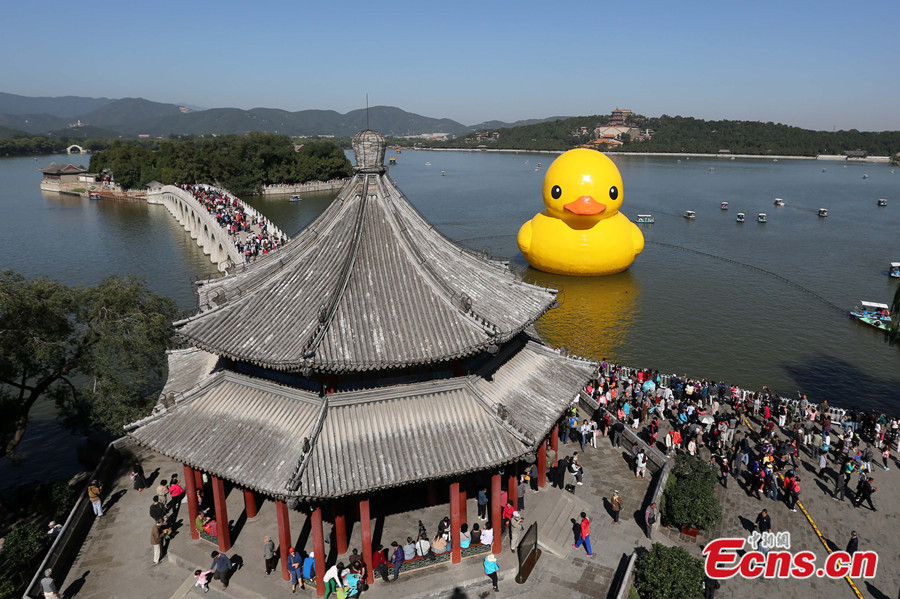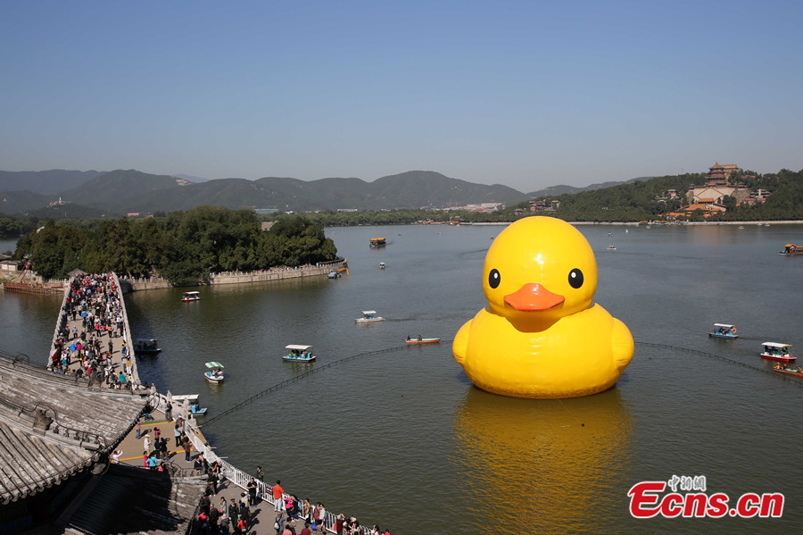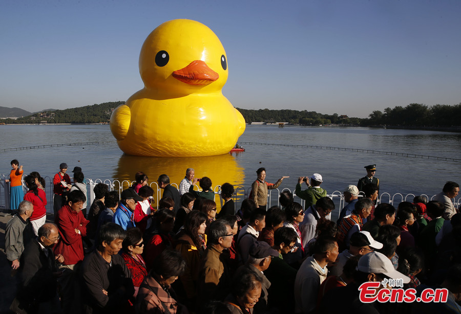 Photo taken on September 26, 2013 shows visitors pose for photos with Dutch artist Florentijn Hofman's giant rubber duck at the Summer Palace in Beijing. [Photo/CFP]