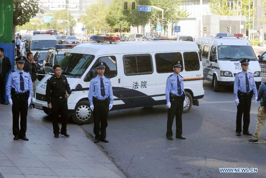 A police vehicle enters the Beijing Haidian District People's Court in Beijing, capital of China, Sept. 26, 2013. The teenage son of Li Shuangjiang, a renowned Chinese tenor, was sentenced to ten years in prison for rape on Thursday, according to the court. Five men were detained on Feb. 21 after a woman surnamed Yang reported to police that she had been taken to a hotel and gang raped after drinking with the men in a bar on Feb. 17. The case soon came to the spotlight as the son of Li, dean of the music department of the People's Liberation Army Academy of Arts, was among the five suspects. (Xinhua/Gong Lei)
