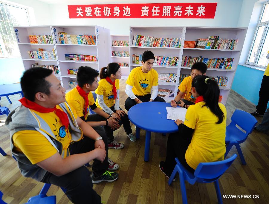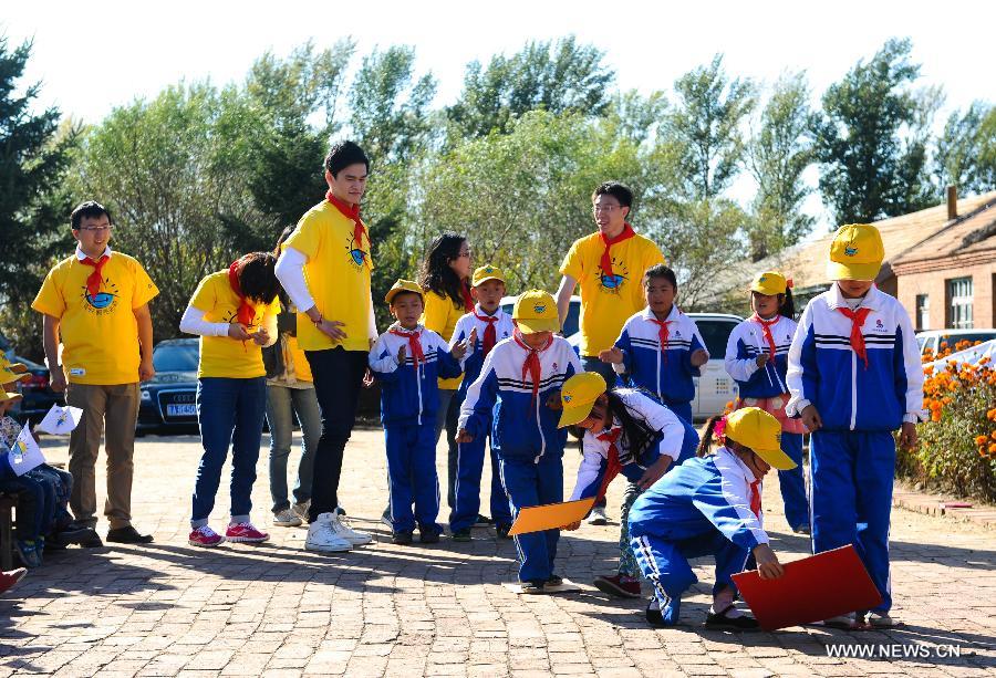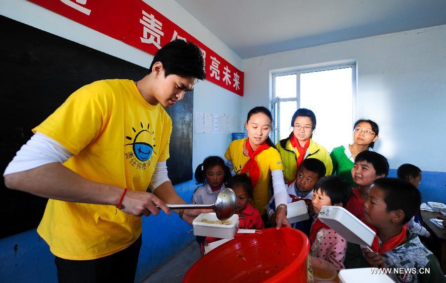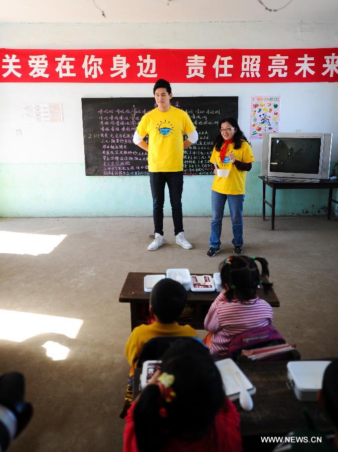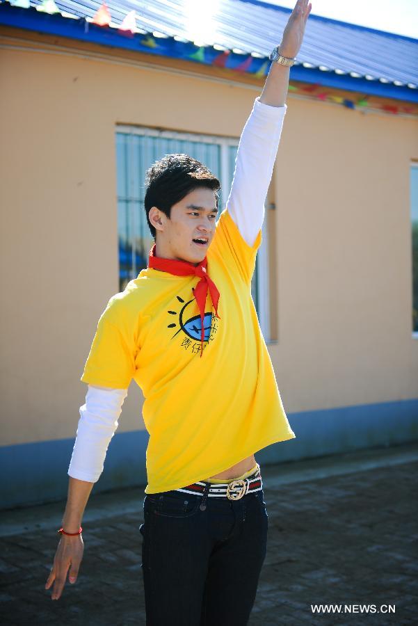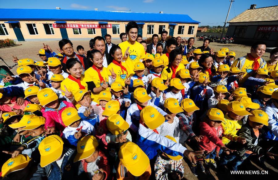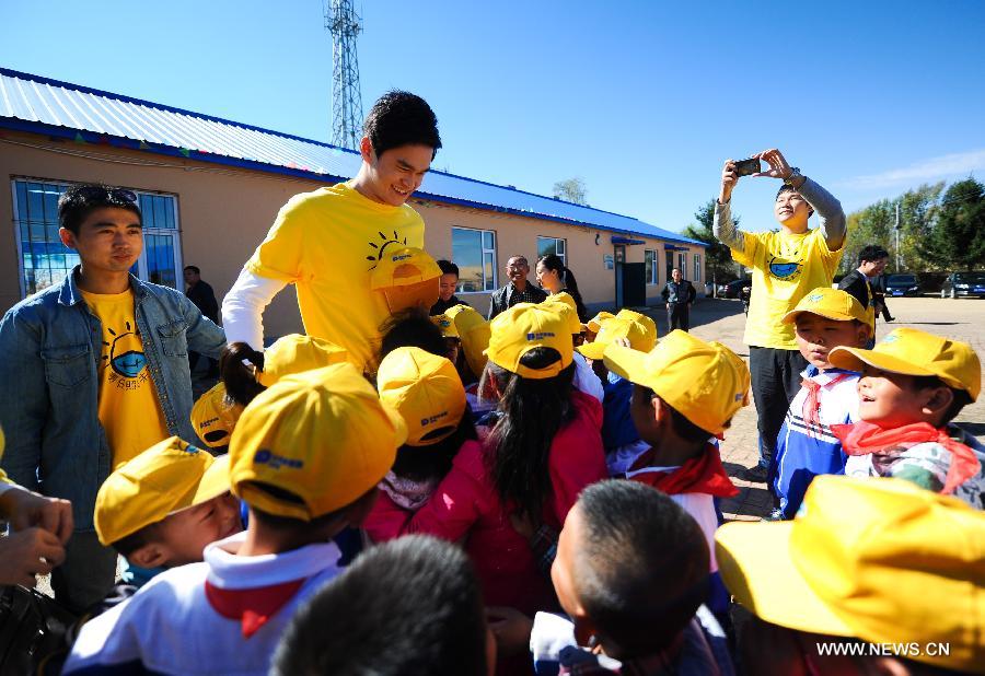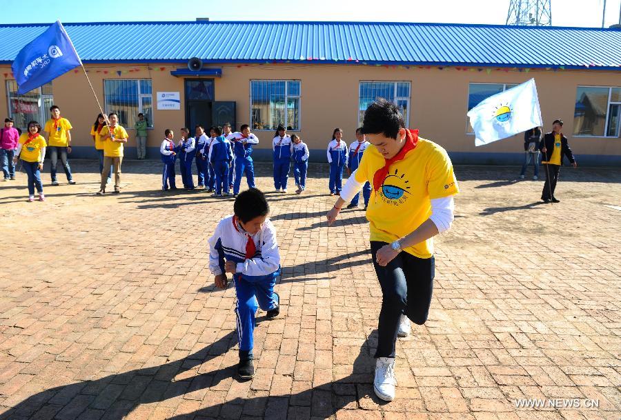 China's Olympic swimming champion Sun Yang (top) teaches in a primary school in Dehui, northeast China's Jilin Province, China, Sept. 26, 2013. Sun Yang showed up as a volunteer teacher in the school Thursday, bringing professtional physical education classses to over one hundred children of the school. (Xinhua/Xu Chang)