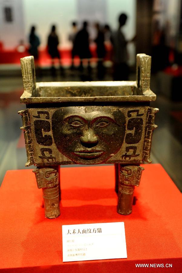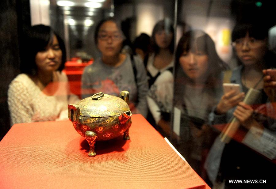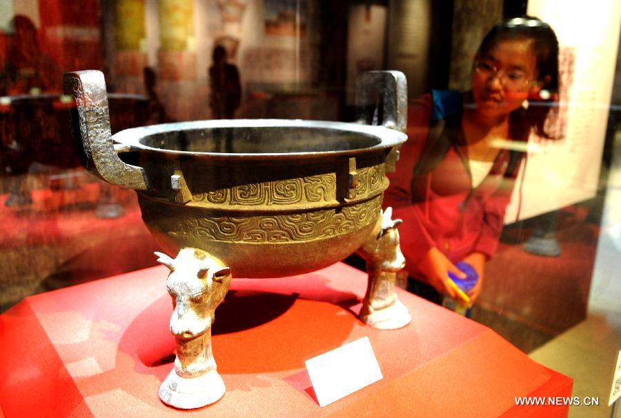 Visitors watch the displayed tripods on Chinese Ding Culture Exhibition in Zhengzhou, capital of central China's Henan Province, Sept. 28, 2013. The exhibition opened here Friday. (Xinhua/Zhu Xiang)