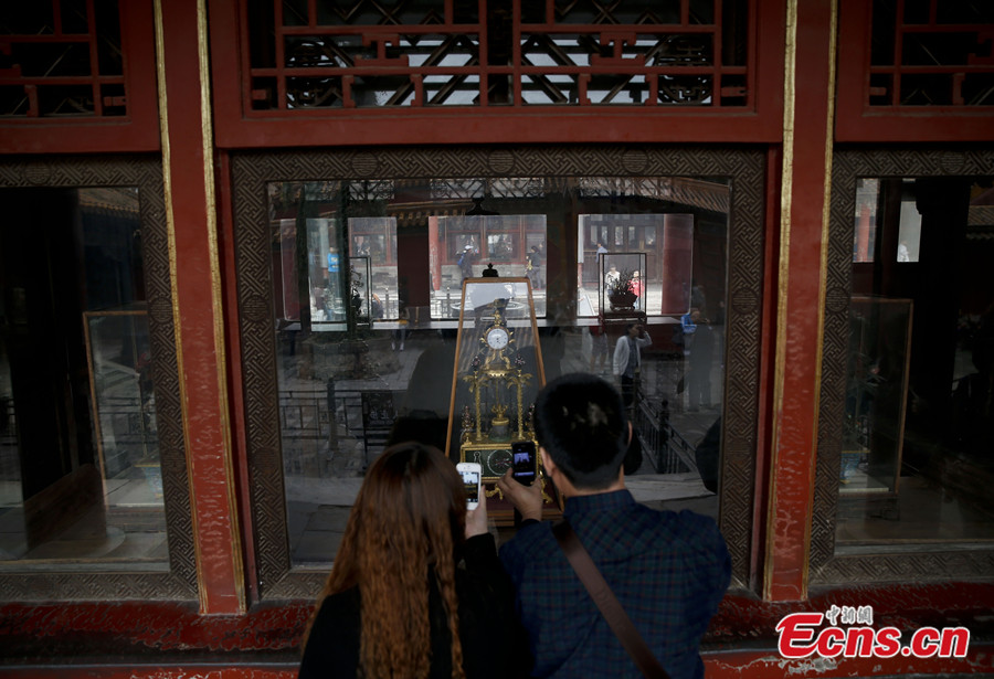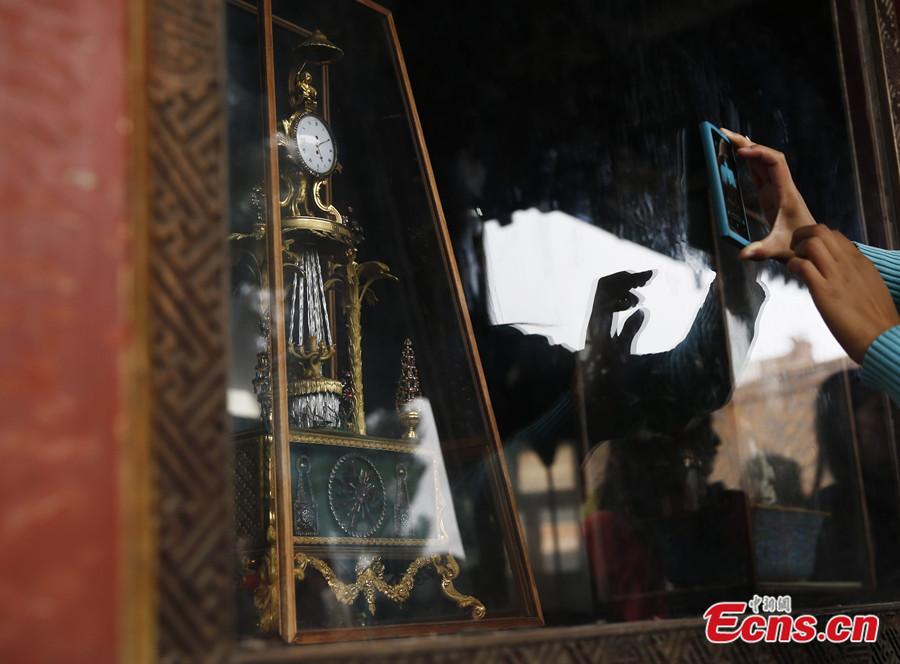 Visitors take photos of an antique clock at Yikungong of the Forbidden City in Beijing on September 29, 2013. The clock was damaged by a visitor on May 4 this year and it goes back on display after repair ahead of the National Day holidays. [Photo: China News Service / Liu Guanguan]