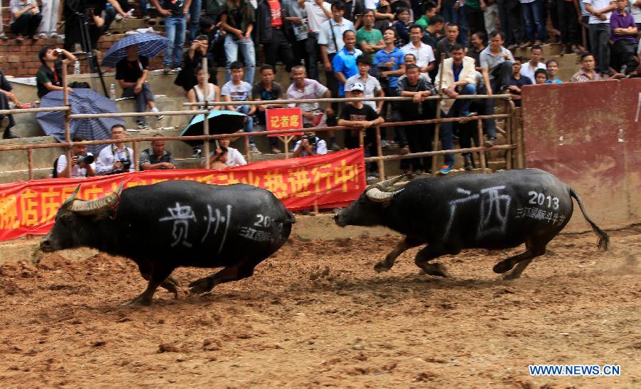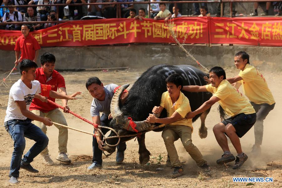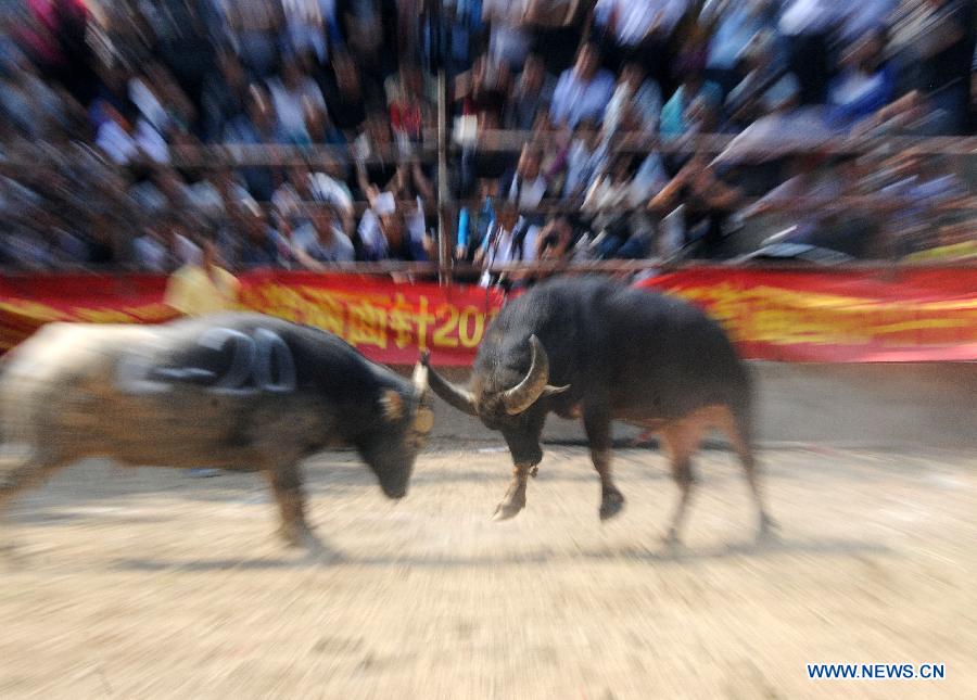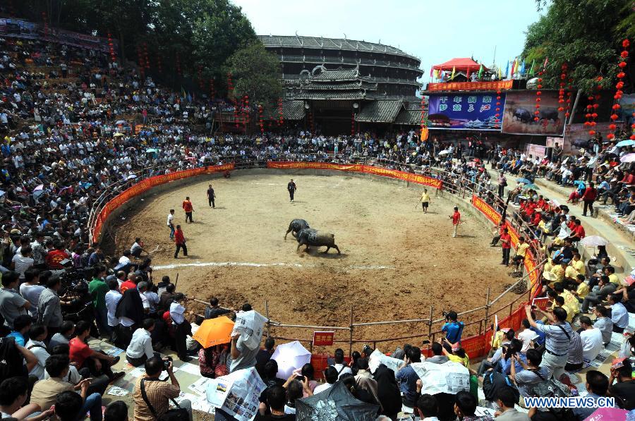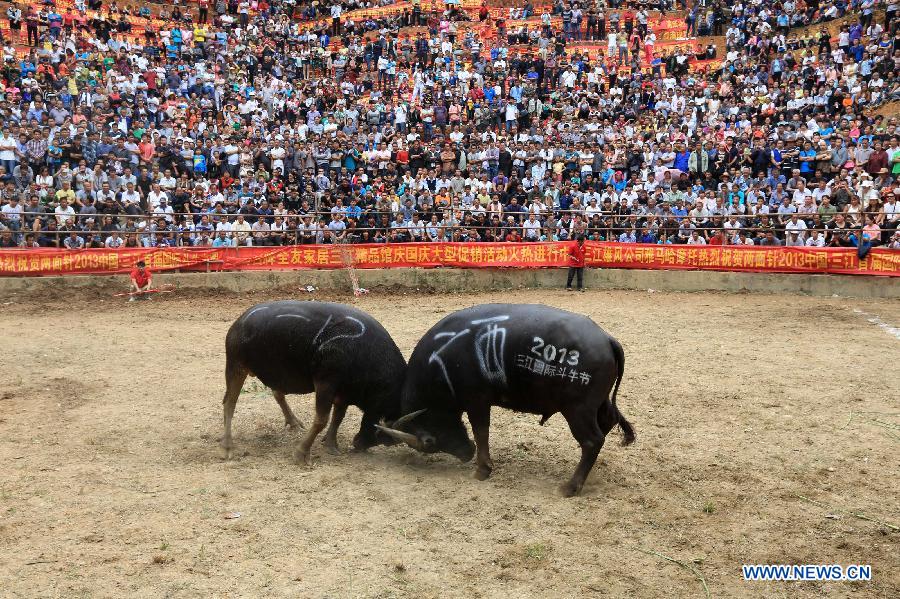Visitors watch a bullfight festival at Dong Autonomous County of Sanjiang in Liuzhou City, south China's Guangxi Zhuang Autonomous Region, Oct. 1, 2013. A bullfight festival was held here on Tuesday. (Xinhua/Liang Kechuan)