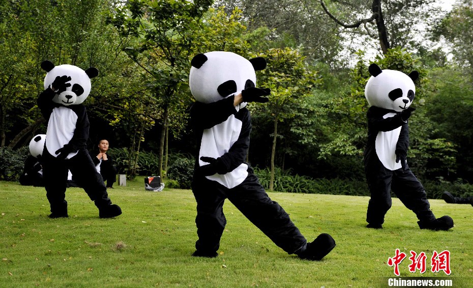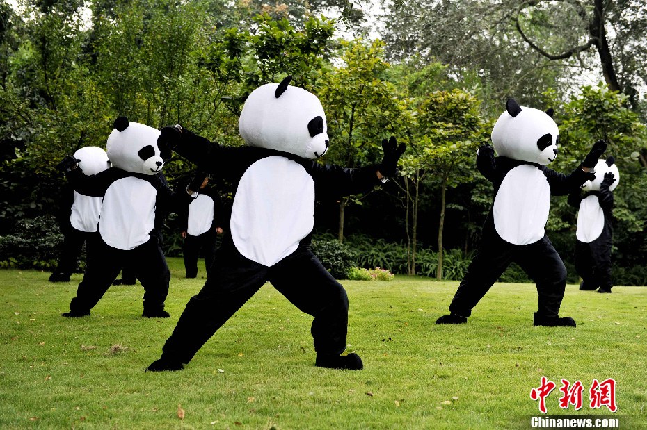 Photo taken on Oct. 1 shows people dressed up in panda clothes play Taichi at Chengdu Giant Panda Breeding Research Base, Sichuan province. (Photo: An Yuan/China News Service)