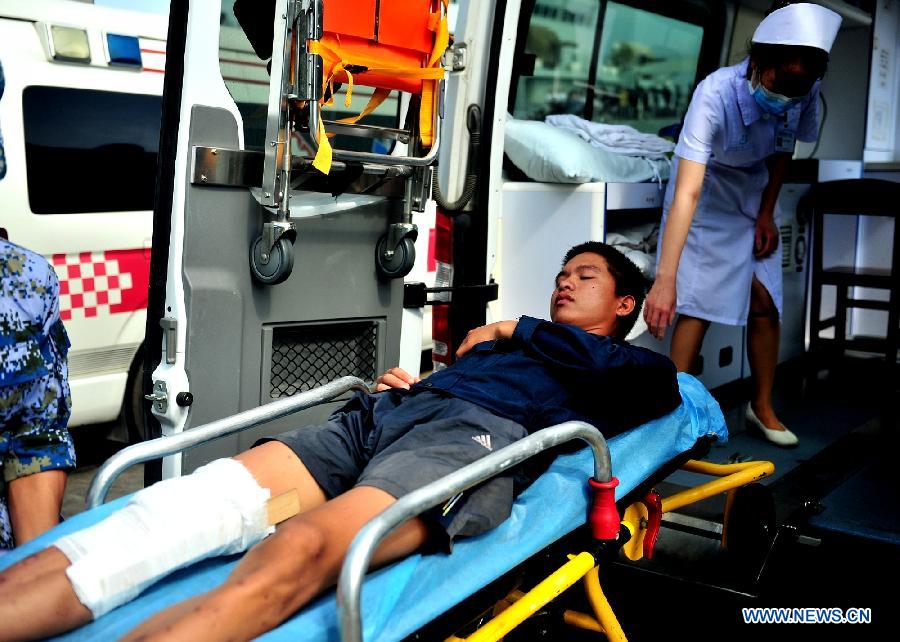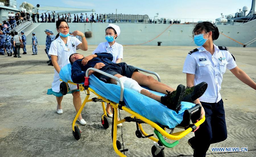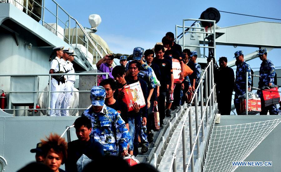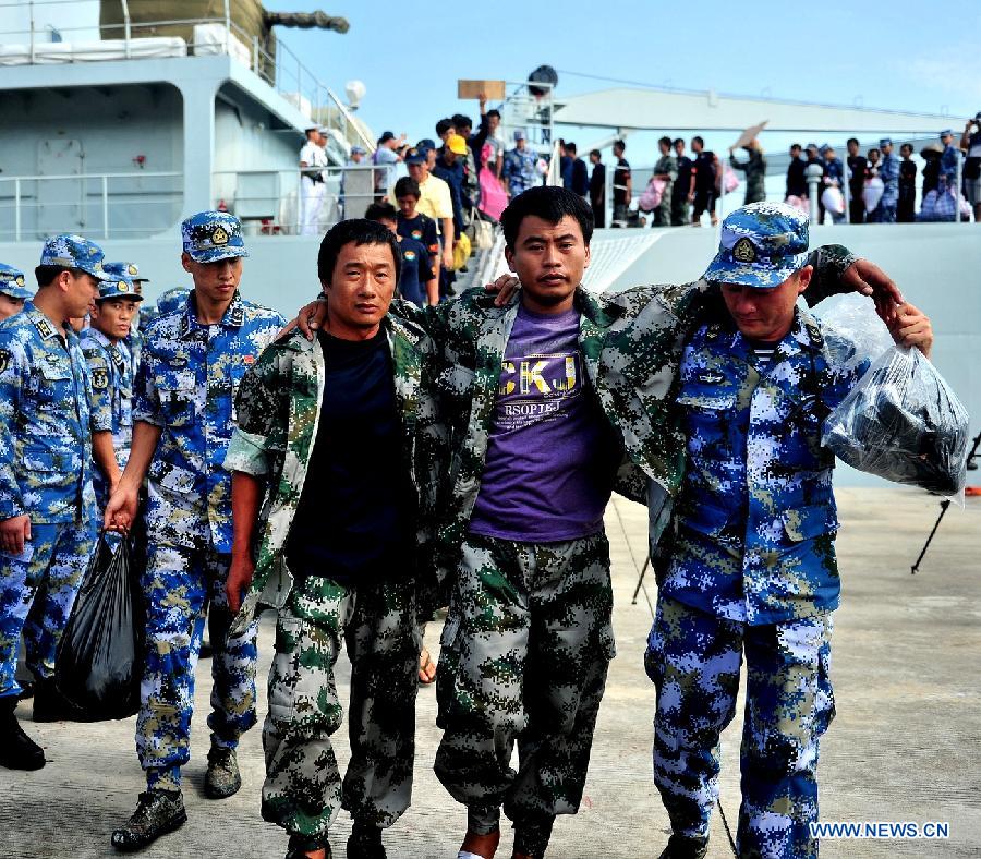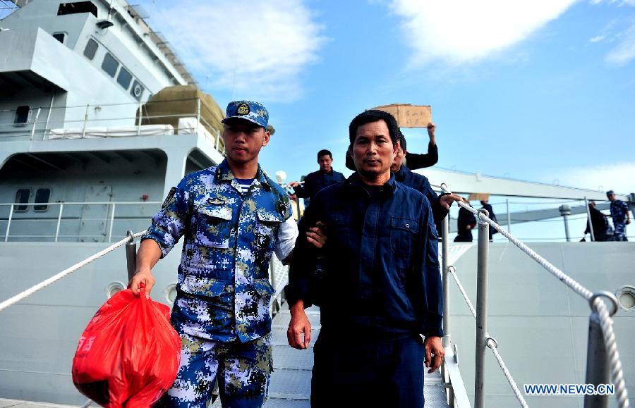 Rescued fishermen disembark after arriving at a naval port in Sanya, south China's Hainan Province, Oct. 3, 2013. A total of 268 fishermen who were trapped by Typhoon Wutip in the South China Sea arrived in Sanya Thursday morning after 15 hours of sail in navy vessels. Rescue work continued on Thursday as 58 fishermen remained missing after three fishing boats sank near the Shanhu Island in the Xisha Islands, about 330 kilometers from the Hainan Island due to Typhoon Wutip on Sunday afternoon. (Xinhua/Zhang Yongfeng)