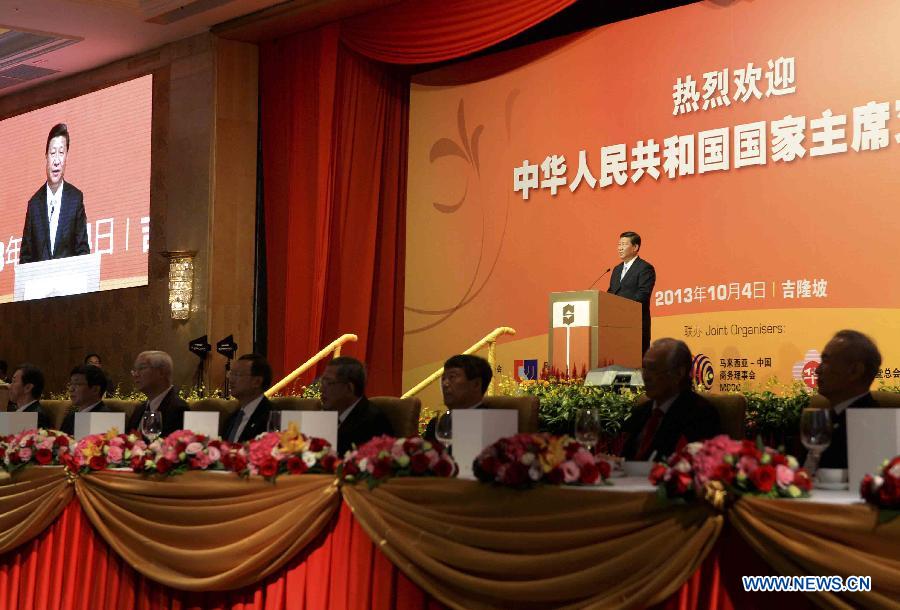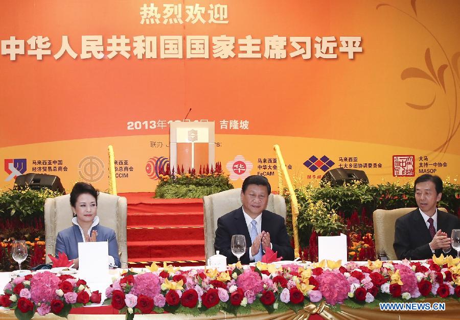 Chinese President Xi Jinping (C) and his wife Peng Liyuan (L) attend a welcoming luncheon hosted by overseas Chinese and Chinese Malaysians in Kuala Lumpur, capital of Malaysia, Oct. 4, 2013. (Xinhua/Pang XingLei)