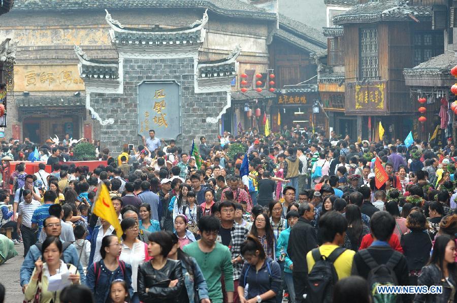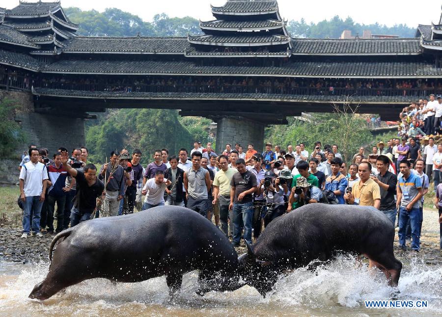A traditional bullfight is held by the Batuan Bridge, a covered wooden bridge of the local Dong ethnic group dubbed "wind-rain bridge", in Sanjiang Dong Autonomous County, southwest China's Guangxi Zhuang Autonomous Region, Oct. 4, 2013. (Xinhua/Tan Kaixing)