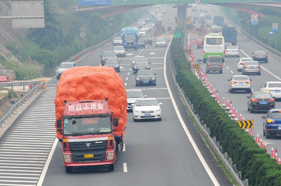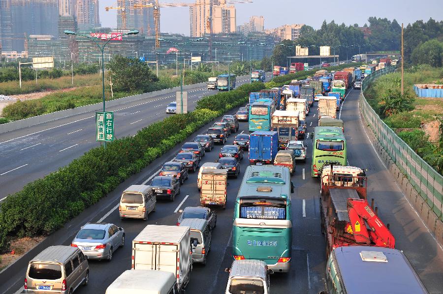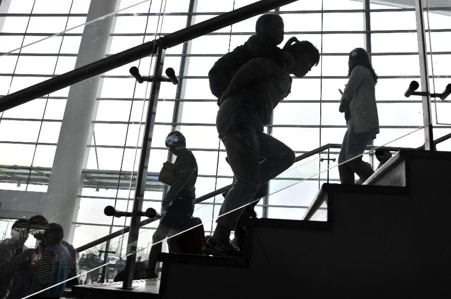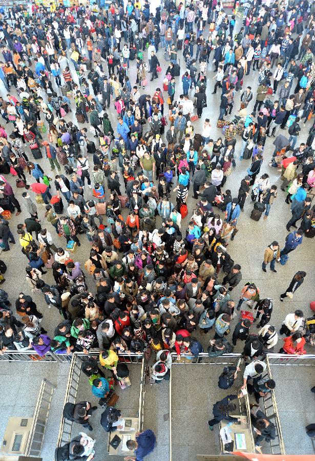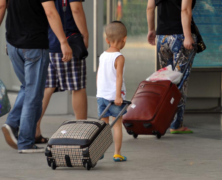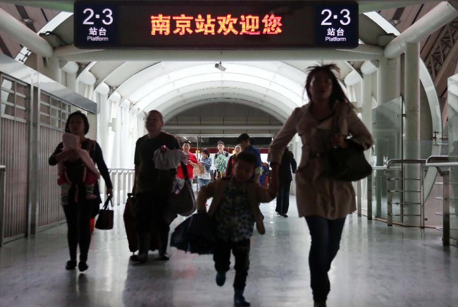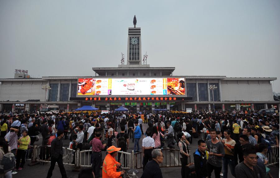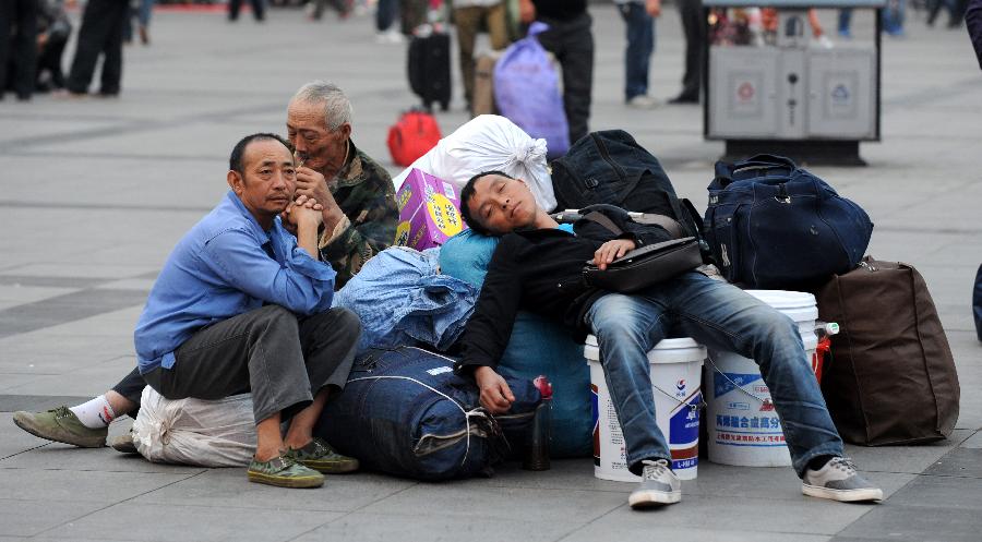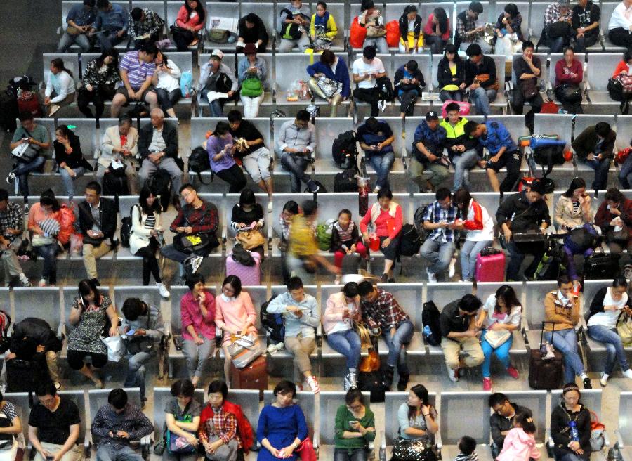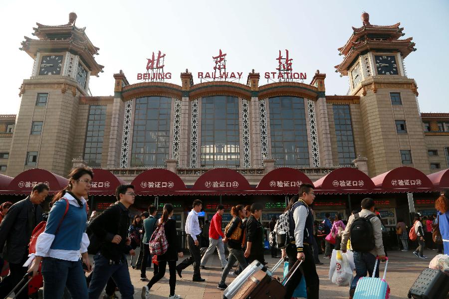 Passengers walk out of the Beijing Railway Station in Beijing, capital of China, Oct. 7, 2013. China witnessed a travel peak on Monday, as many people were on their return trip on the last day of the seven-day National Day holiday. (Xinhua/Wang Zhen)