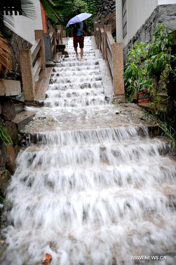 A soldier rescues a woman trapped in the flood caused by Typhoon Fitow in Taoshan Town of Wenzhou City, east China's Zhejiang Province, Oct. 7, 2013. Typhoon Fitow brought torrential rainfalls to Zhejiang on Monday. (Xinhua/Guo Guangjie)