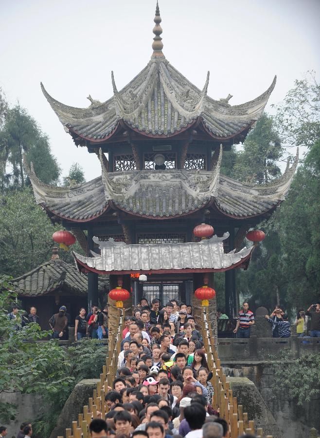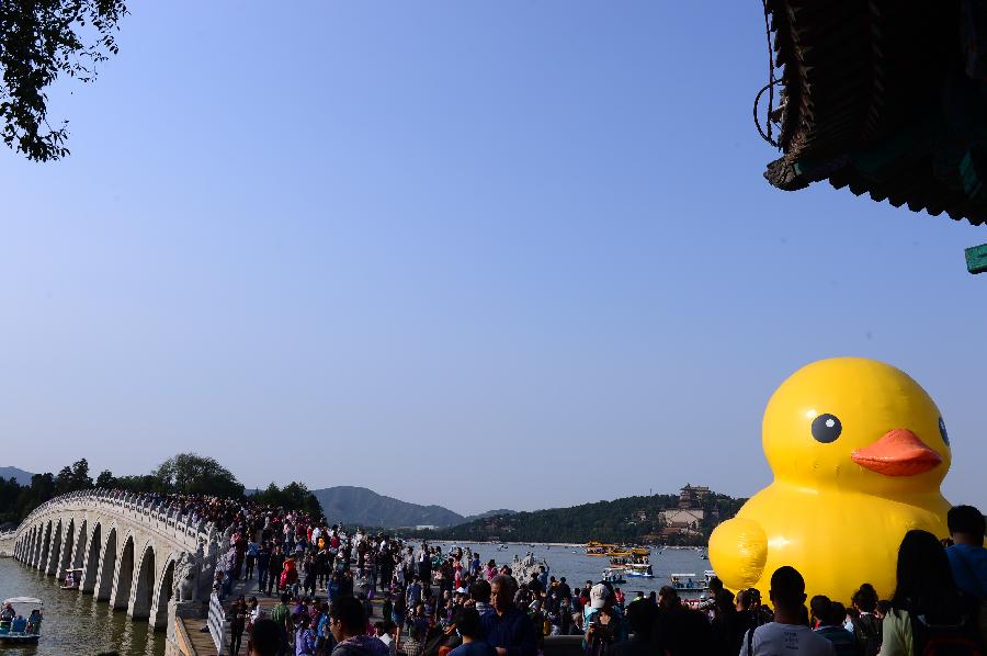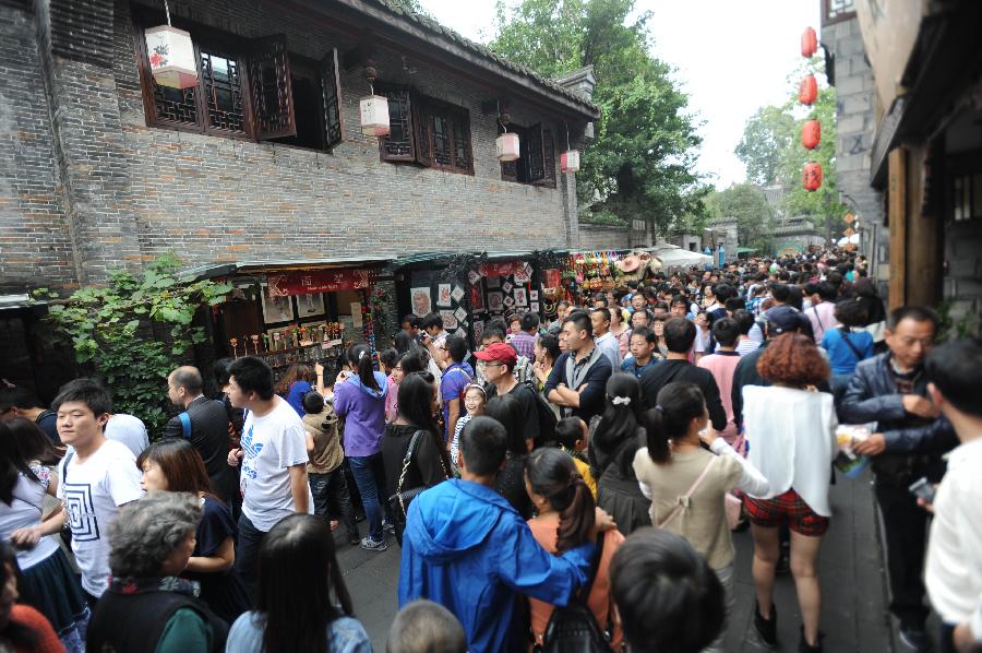 Tourists visit the Bund in Shanghai, east China, Oct. 1, 2013. China's 125 major scenic spots received 31.25 million visitors during the seven-day National Day holidays from Oct. 1, up 6.8 percent from the corresponding period last year. Tourism income surged by nearly 10 percent from 2012 to 1.66 billion yuan (271.24 million U.S. dollars). (Xinhua/Ding Ting)