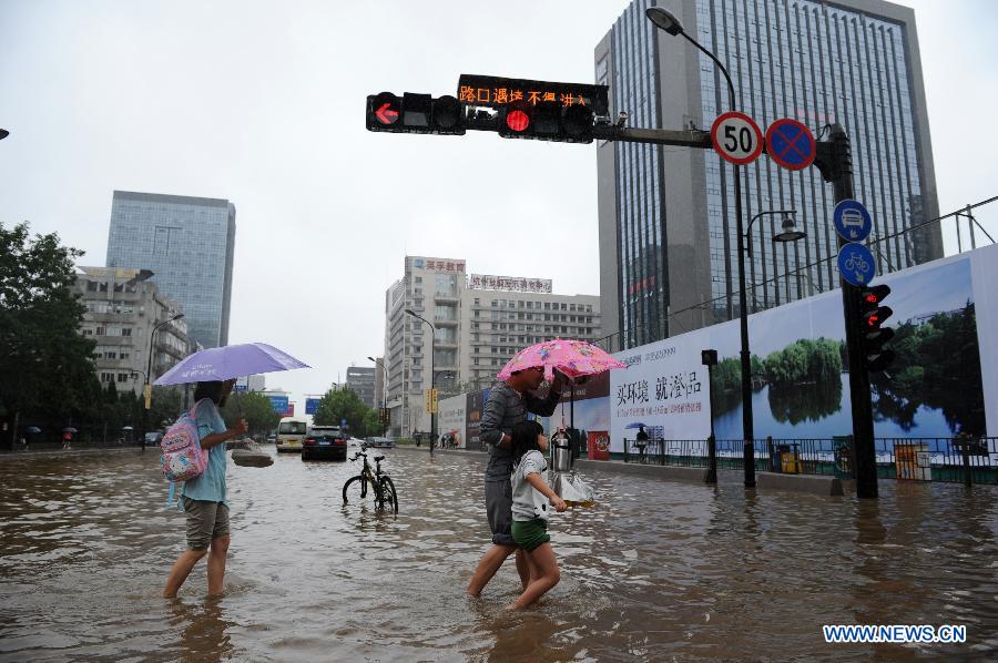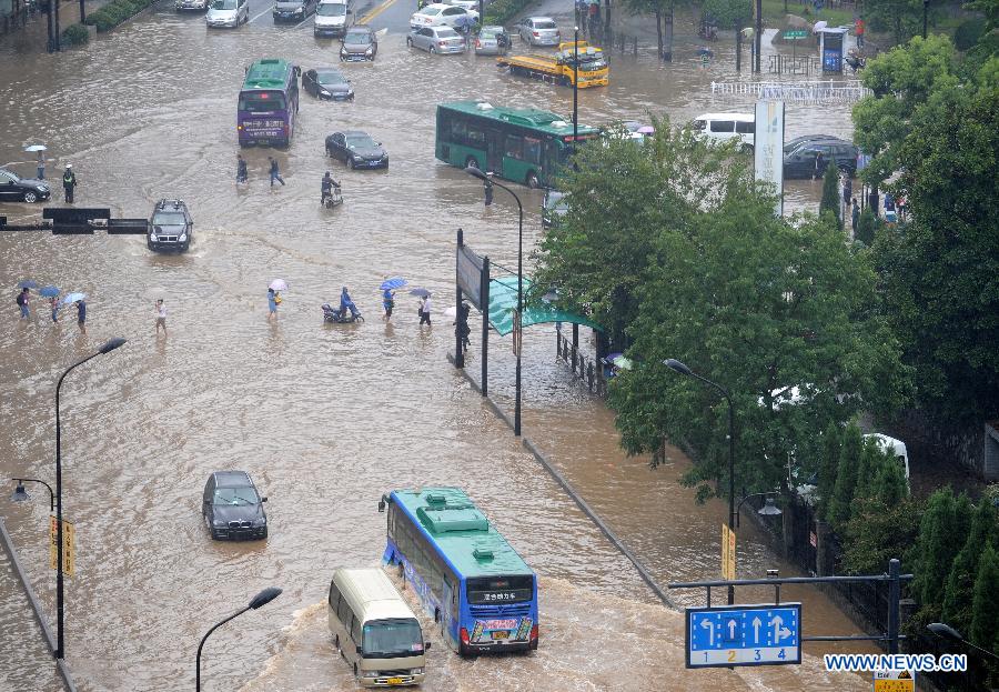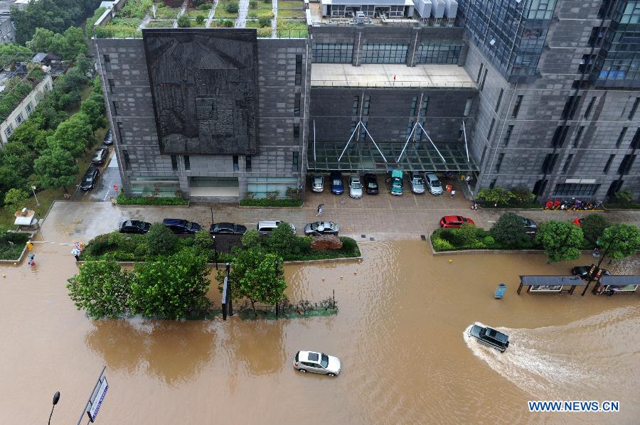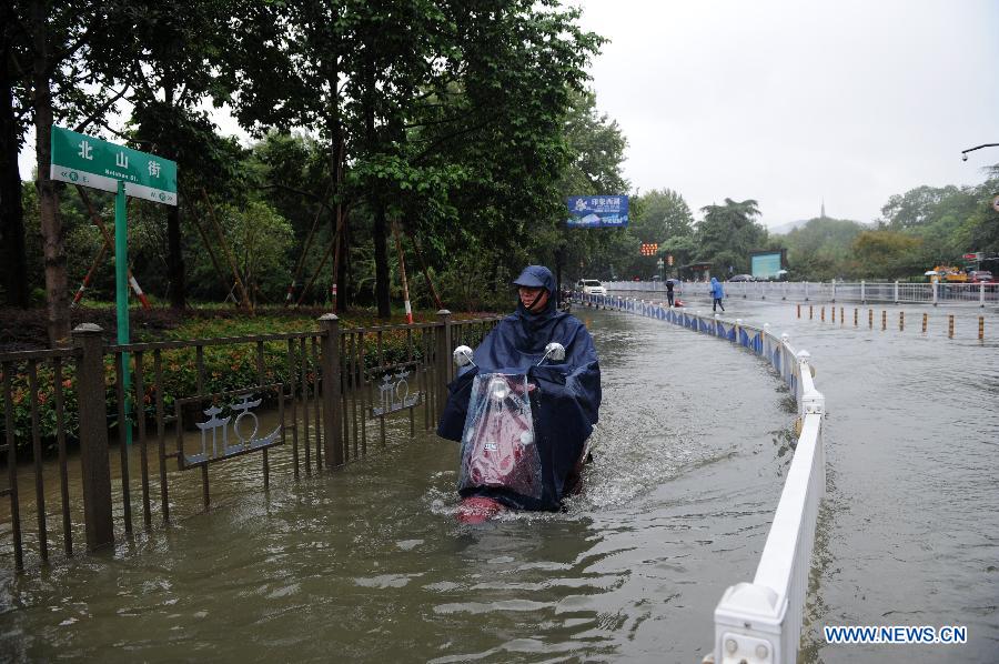 Photo taken on Oct. 8, 2013 shows a waterlogged intersection in Hangzhou, capital of east China's Zhejiang Province. The continuous rainfall brought by Typhoon Fitow caused waterlog in some areas of Hangzhou. (Xinhua/Ju Huanzong)