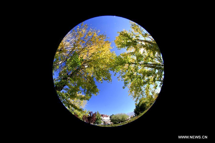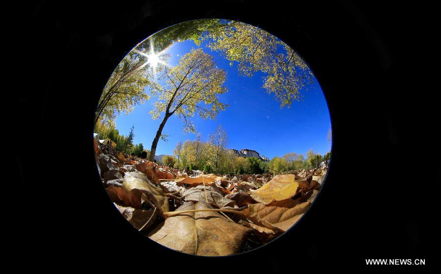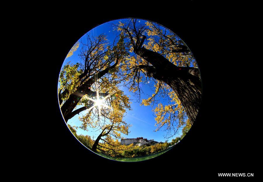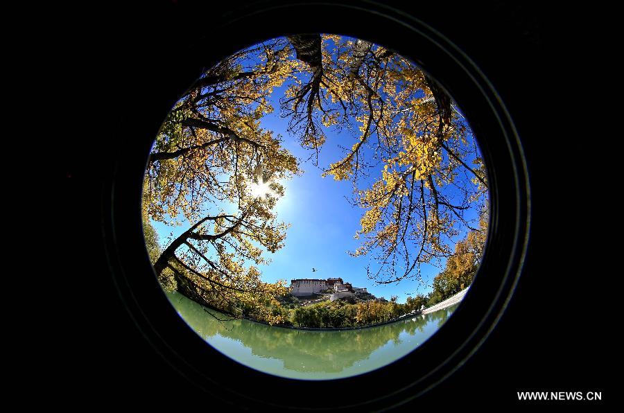 This photo taken with a fisheye lens shows the autumn scenery of the Potala Palace in Lhasa, capital of southwest China's Tibet Autonomous Region, Oct. 9, 2013 (Xinhua/Purbu Zhaxi)