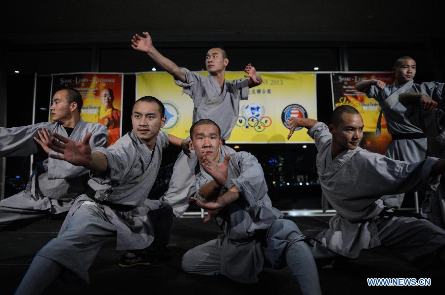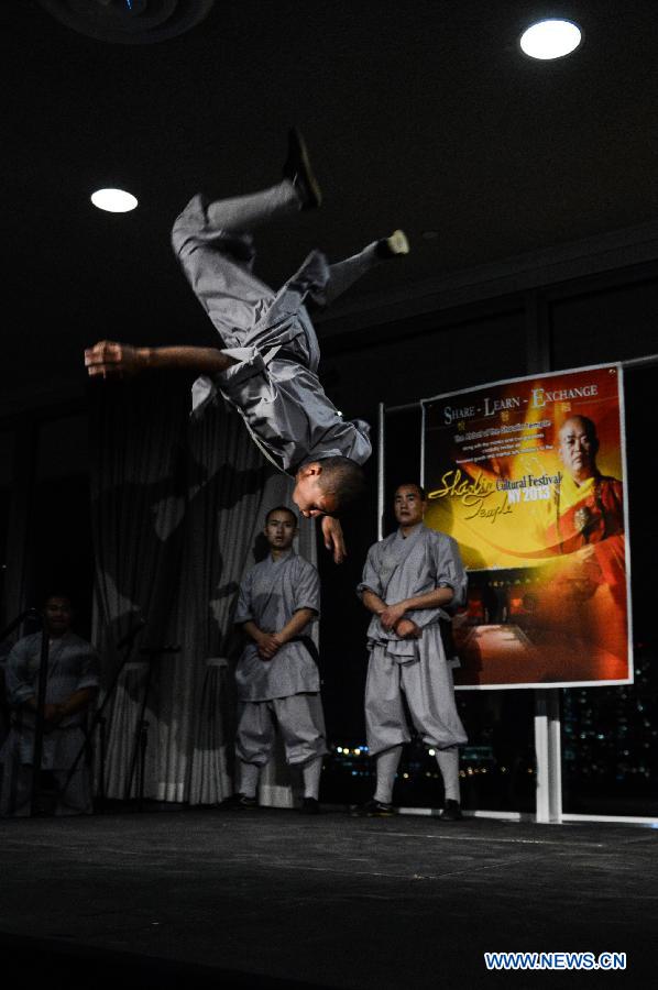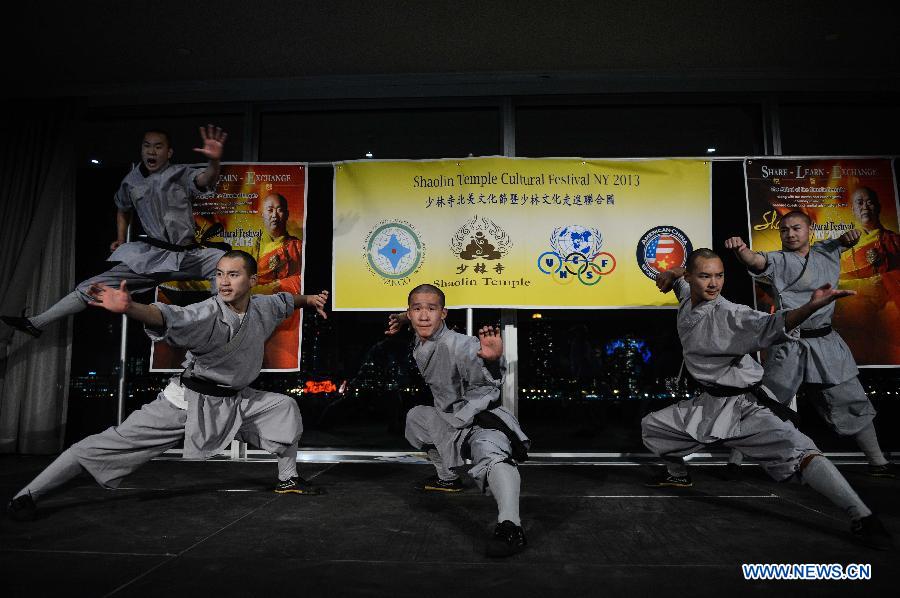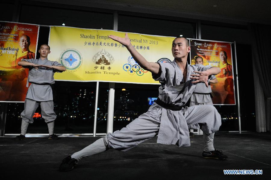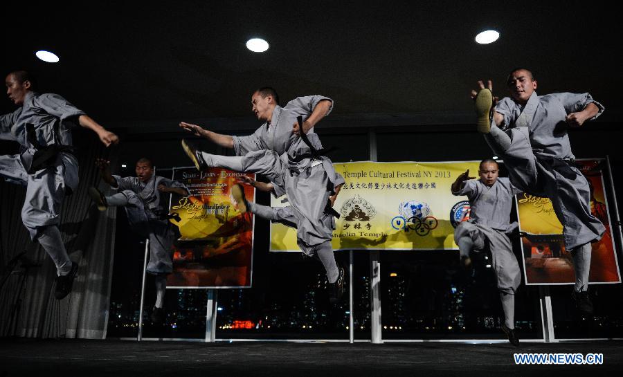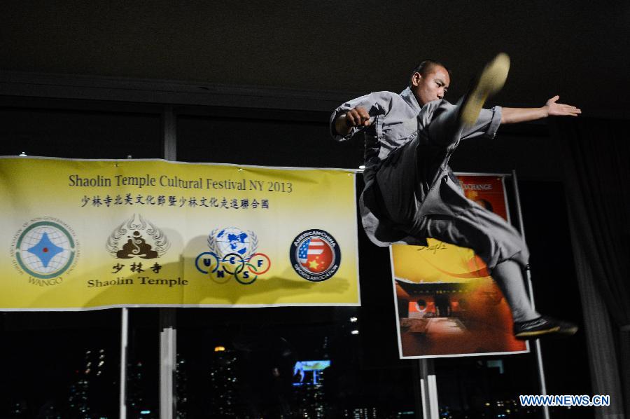 Monks from China's Shaolin Temple demonstrate Kung Fu, or traditional Chinese martial arts, during the first Shaolin Temple cultural festival held at the United Nations headquarters in New York, on Oct. 9, 2013. (Xinhua/Niu Xiaolei)