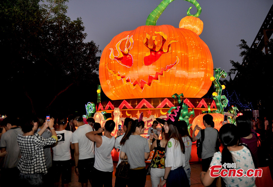 A three-storey-high pumpkin lantern is seen at Chime Long Paradise, a theme park in Guangzhou of Guangdong province, on October 10, 2013. The park launches its annual Halloween activity here on Thursday. [Photo: China News Service / Liu Weiyong]