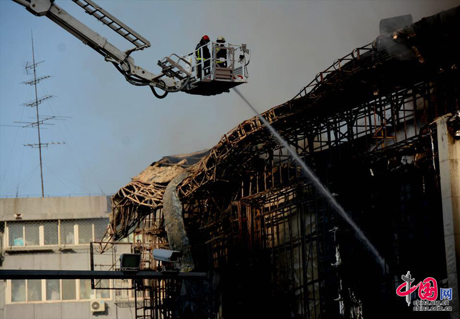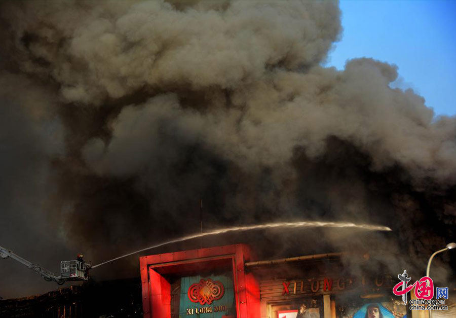 A shopping mall in Shijingshan District, west Beijing, caught fire early Friday morning. A total of 49 fire engines were dispatched to put out the fire. CCTV reported that the fire started from the workshop of the McDonald's in that mall. (Source: China.org.cn)