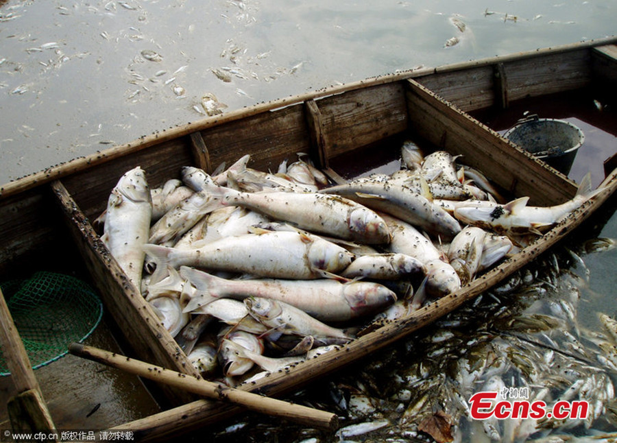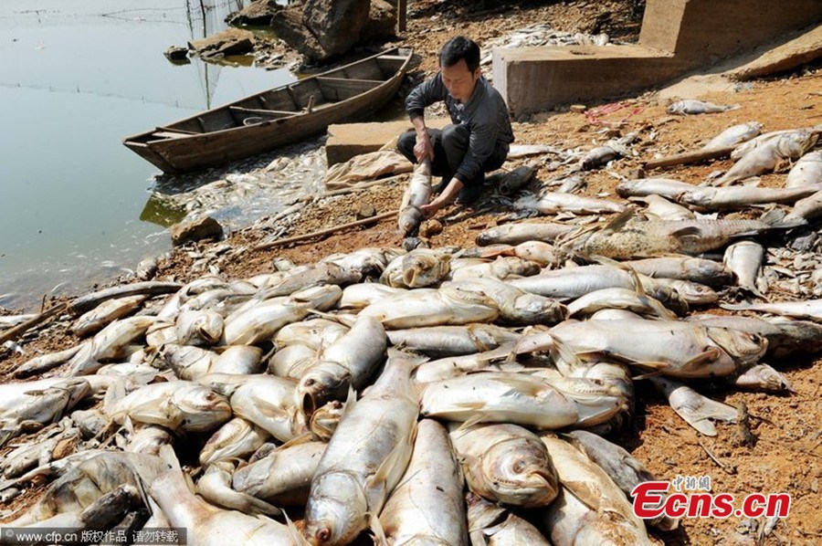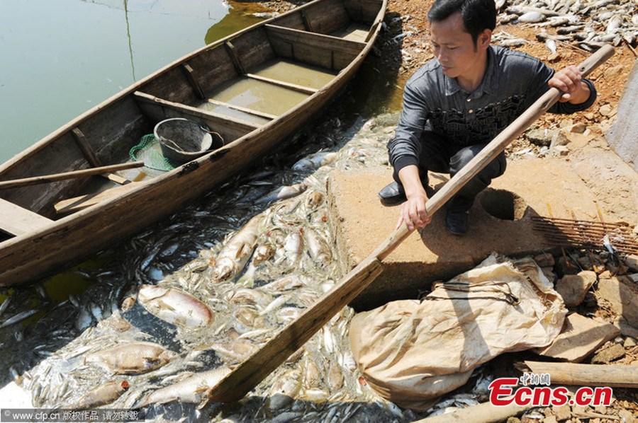 Nearly 20,000 kilograms of fish die in a poisoning incident at Shanghe Village of Dexing City in east China's Jiangxi province on October 11, 2013. According to local public security authorities, water of the fish pond was poisoned deliberately. Zhang Qisheng, owner of the pond, suffers from a loss of about 300,000 yuan. [Photo/CFP]