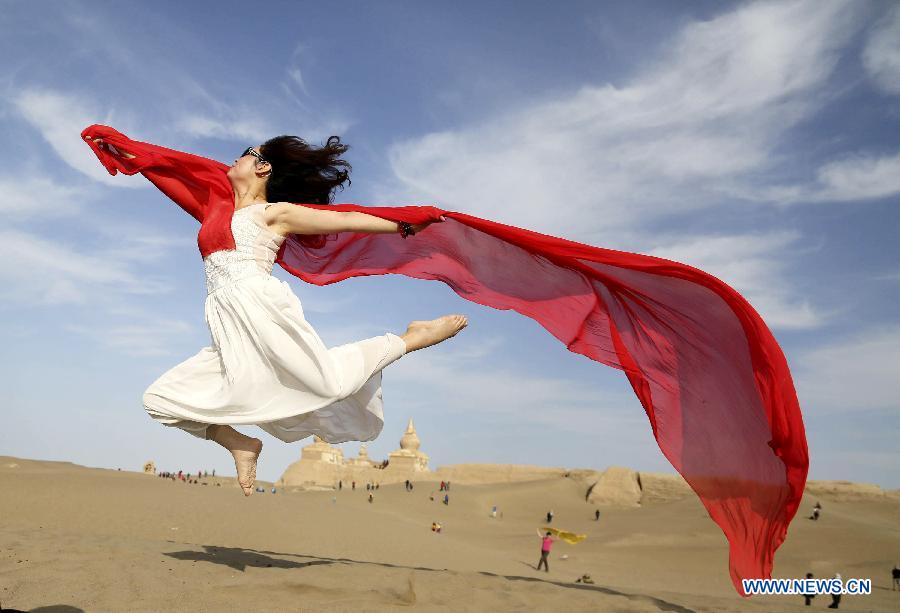 A tourist poses for a photo in Heicheng, an ancient city on the Silk Road built in China's Western Xia Dynasty (1038-1227), in Ejina Banner of Alashan, north China's Inner Mongolia Autonomous Region, Oct. 11, 2013. (Xinhua/Wang Zhen)