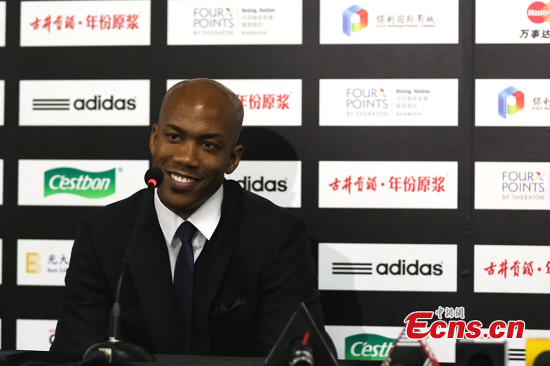 Beijing Ducks star Stephen Marbury poses with club manager Yuan Chao during a press conference to announce his three-year extension with the club in Beijing on Friday, Oct.11, 2013. Marbury becomes the first CBA international player to sign a three-year contract with one club. (Photo: China News Service/Xiong Ran)