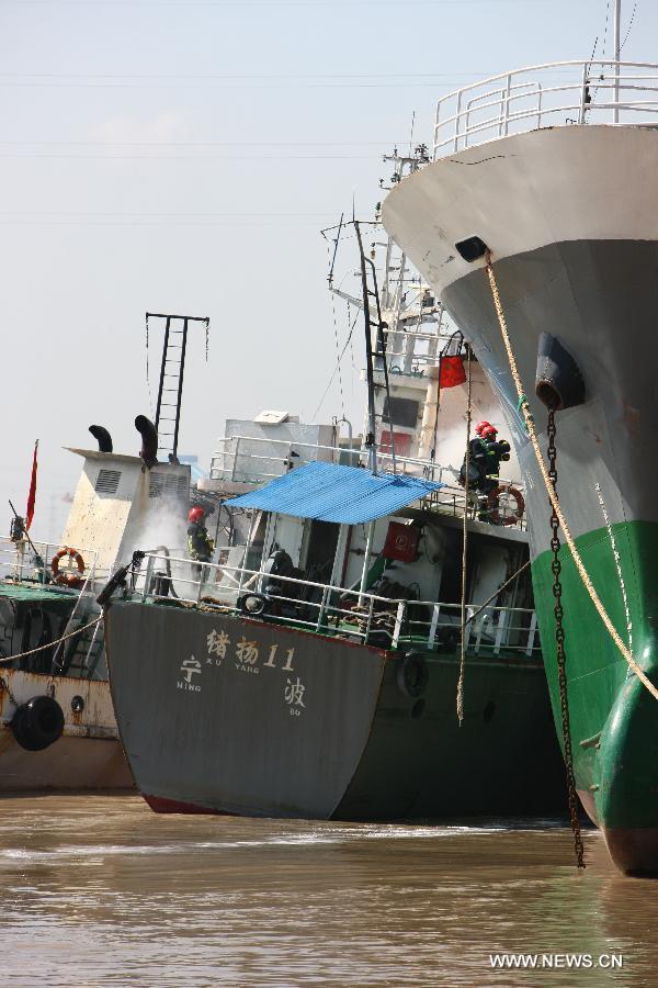 Photo taken on Oct. 12, 2013 shows the scene of an oil tanker explosion at a shipyard in Zhenhai District of Ningbo, east China's Zhejiang Province. Seven people were confirmed dead and another injured in an oil tanker explosion happening around 8:40 a.m. on Saturday, according to the local government. (Xinhua/Zhang Peijian)