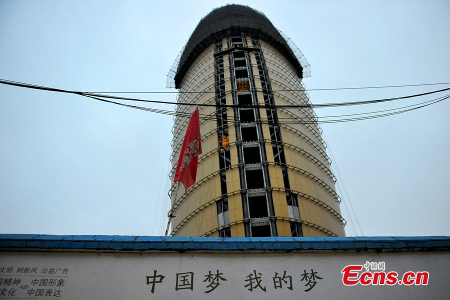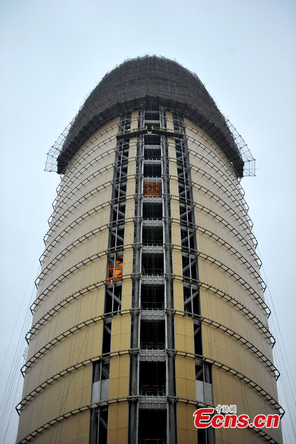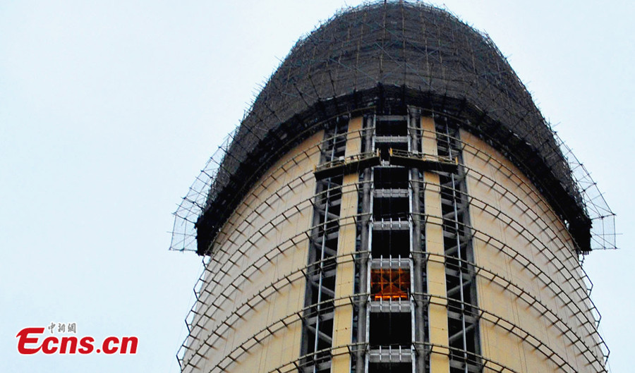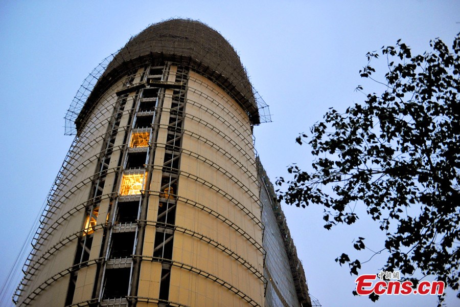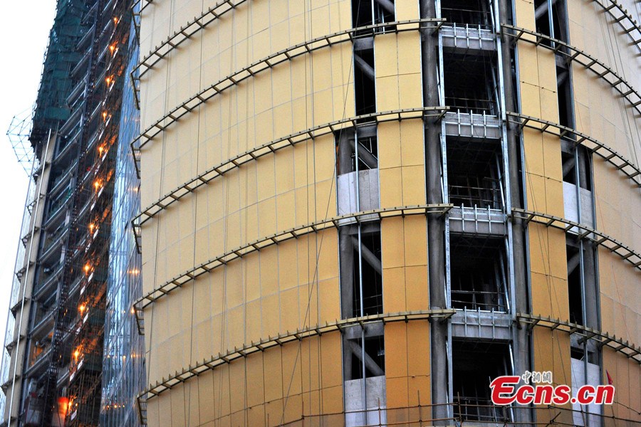 Photo shows "local tyrant gold" -covered People's Daily headquarters is under construction in Beijing's CBD area. "Local tyrant gold", is derived from the term "local tyrant", and has become a popular phrase in China. It is used to describe the gold iPhone 5S. Apple calls the color "champagne gold," but many Chinese Internet users have adopted the more satirical and critical description "local tyrant gold" to refer to rich showoffs. [Photo: Chinanews.com / Jin Shuo]